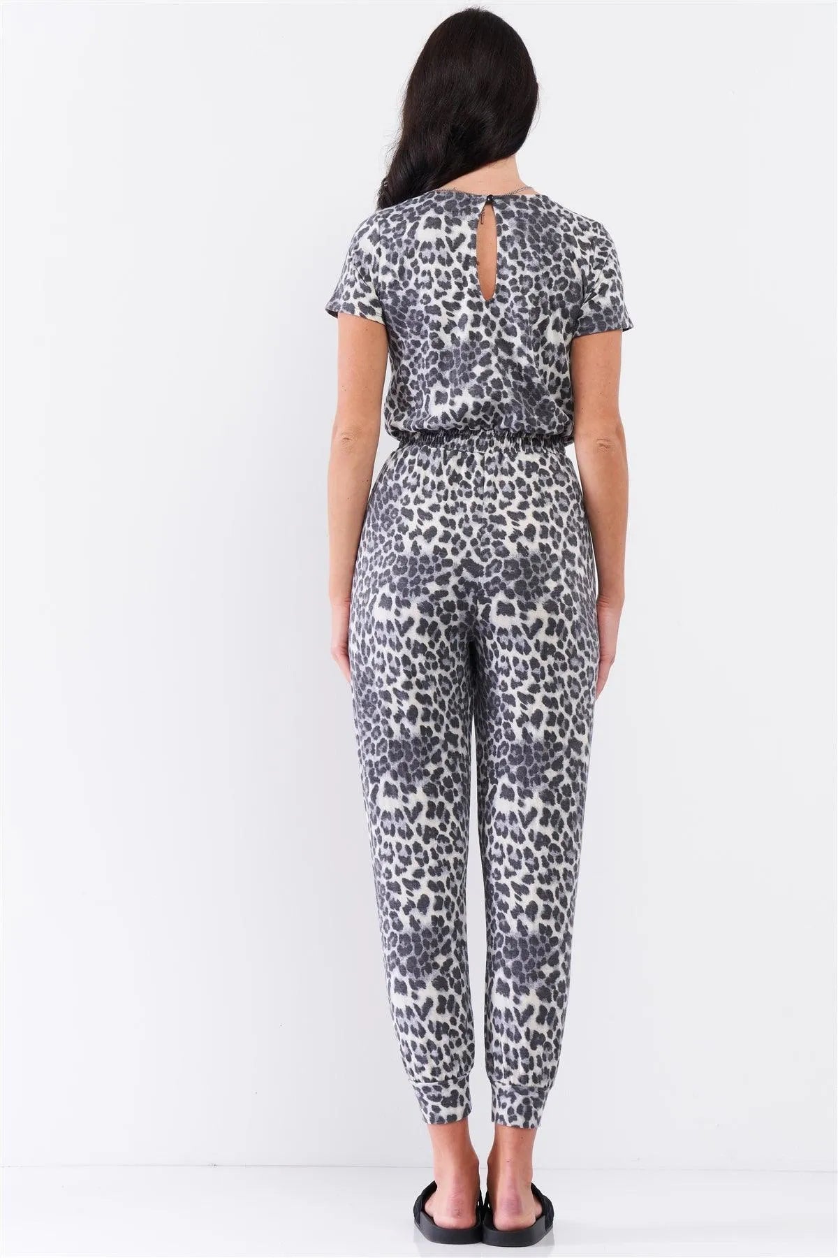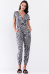 🖤 Item Features: Charcoal grey, leopard print, short sleeve, wrap deep plunge V-neckline with back button loop closure, stretchy draw-string self-tie waistline, jogger bottom with cuffed hem, unlined, stretchy, comfy, casual, loungewear, trendy print, fall/winter collection.