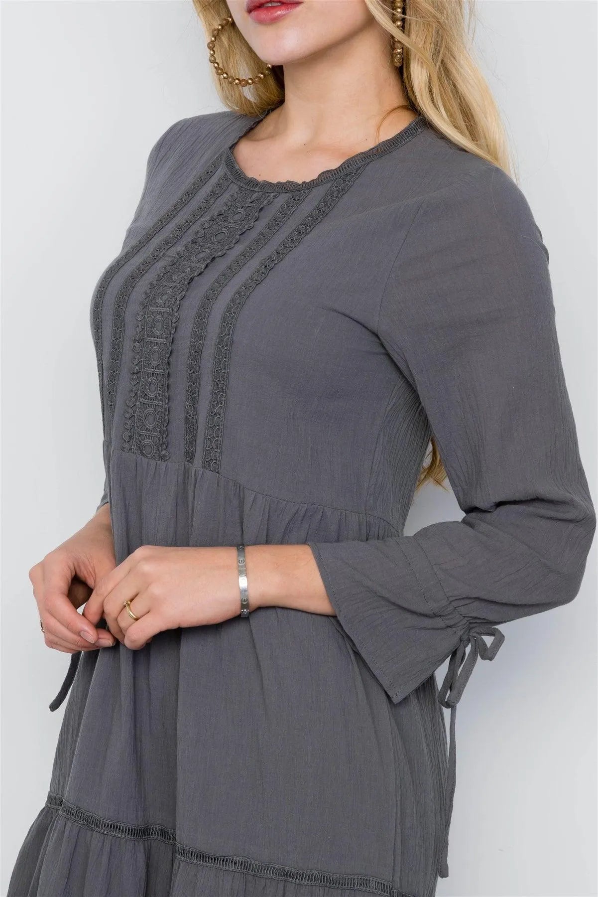 Dress features: long sleeves, lined, crochet detailing at bust, loose fit, tie strap at cuffs, flawy silhouette, round neckline, button closureModel is 5'9" and wearing small (Waist: 28", Bust: 34C", Hips: 36" )Small Size Item Measurements: Length: 51", Bust: 34", Sleeve Length: 22"