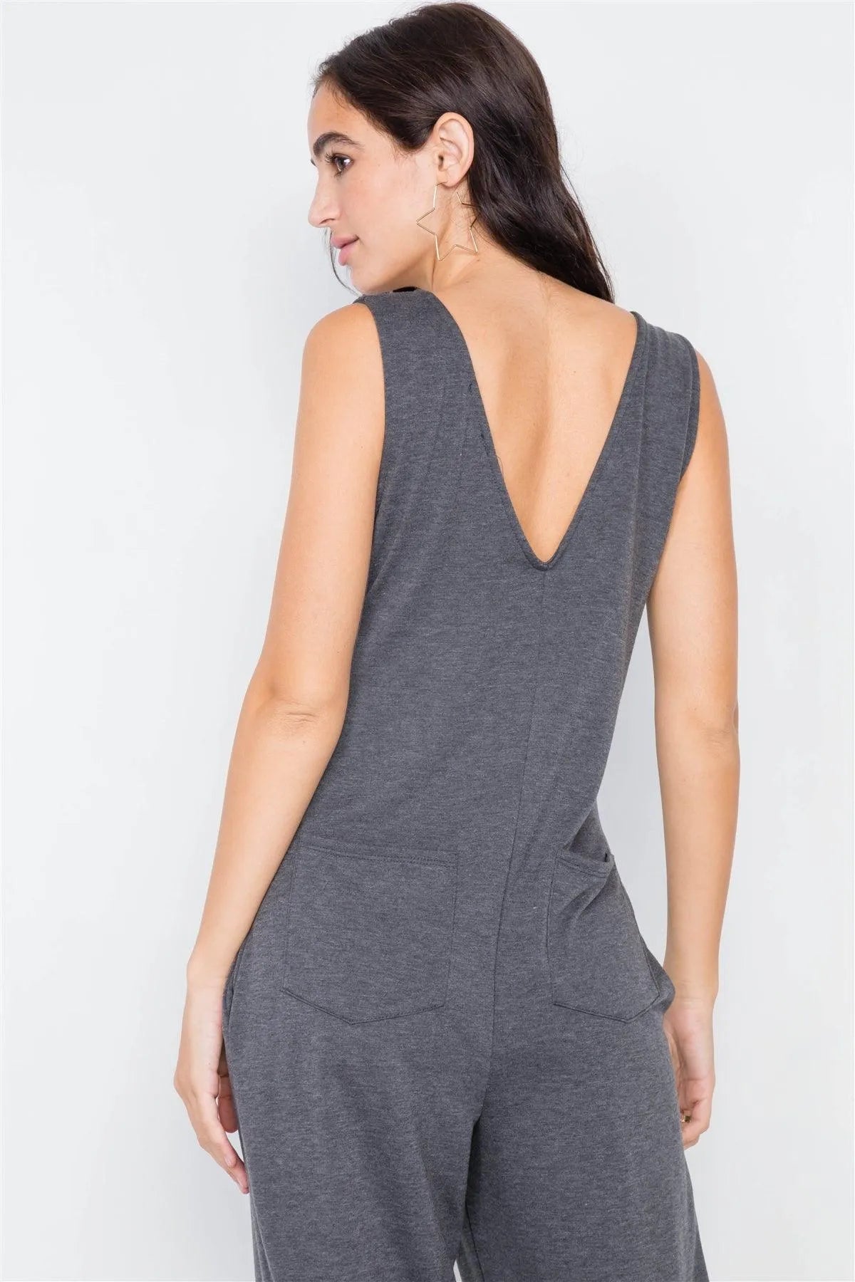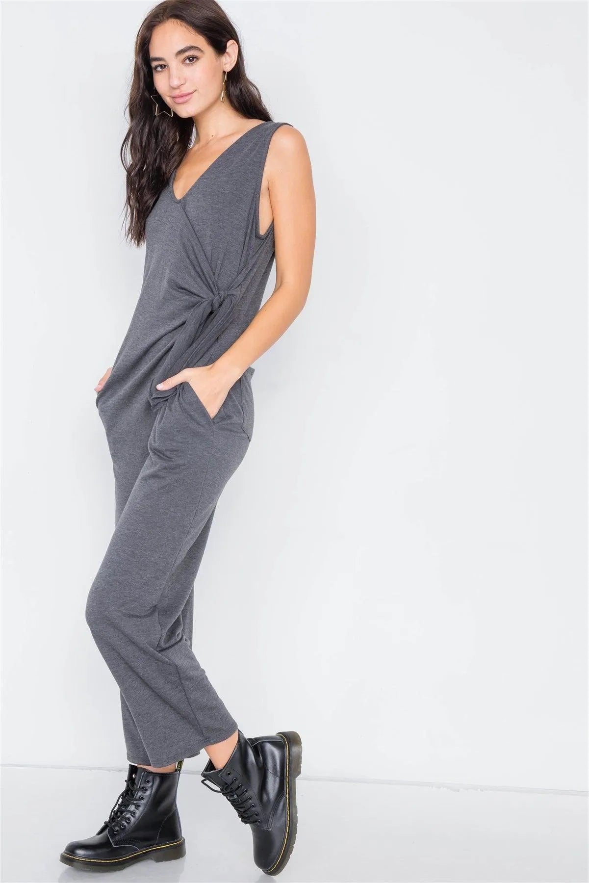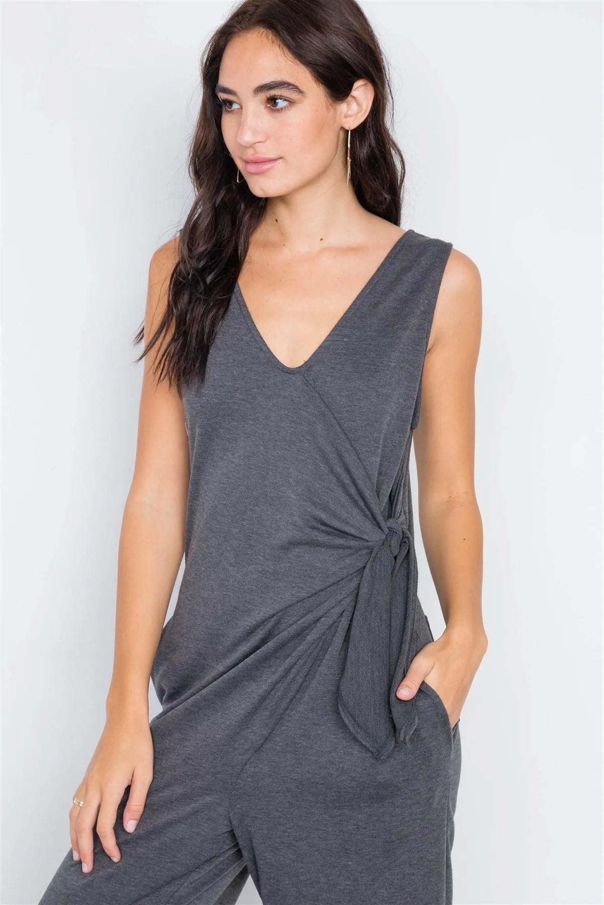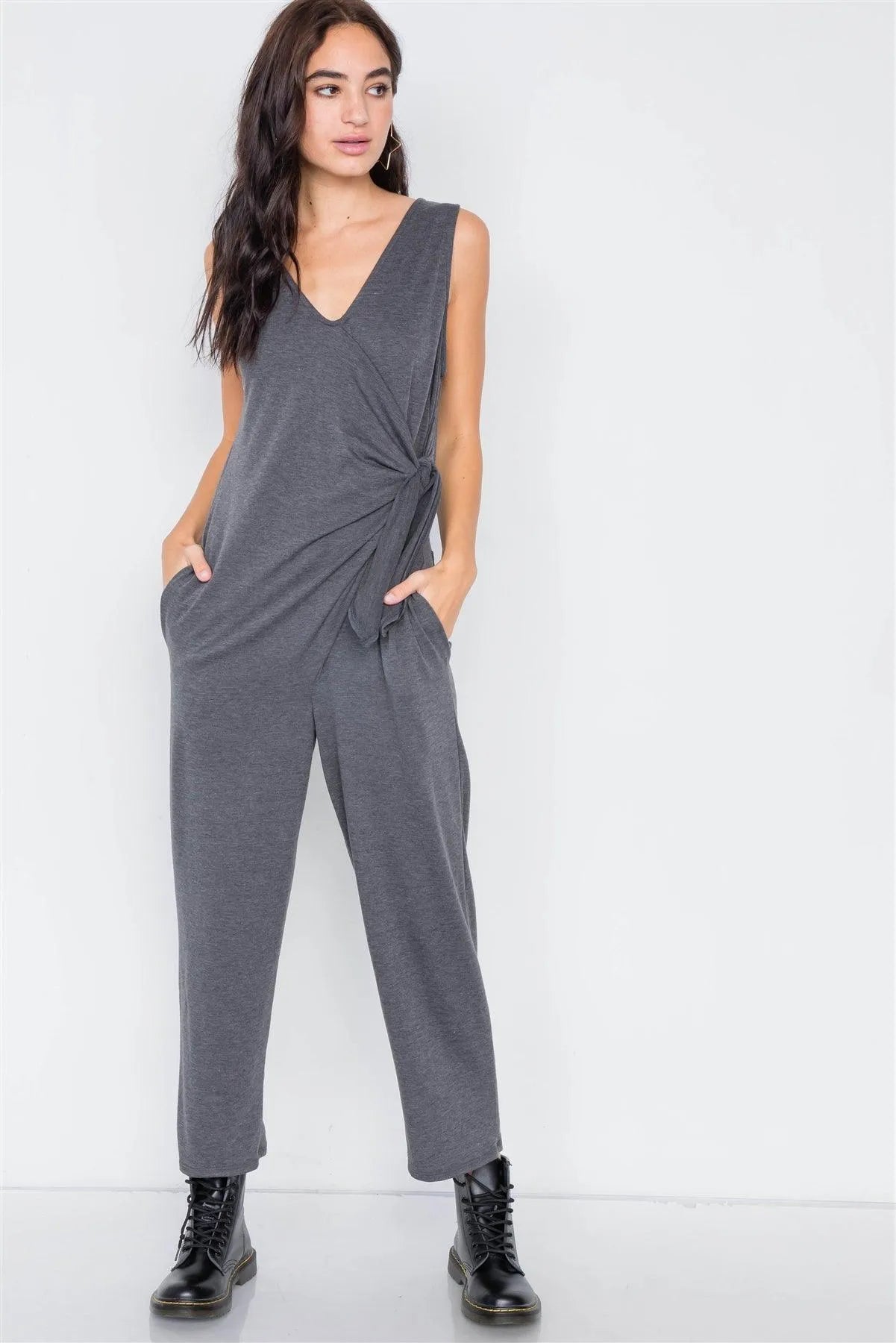 Charcoal Marled Knit Mock Wrap Ankle Length Jumpsuit /1-2-2