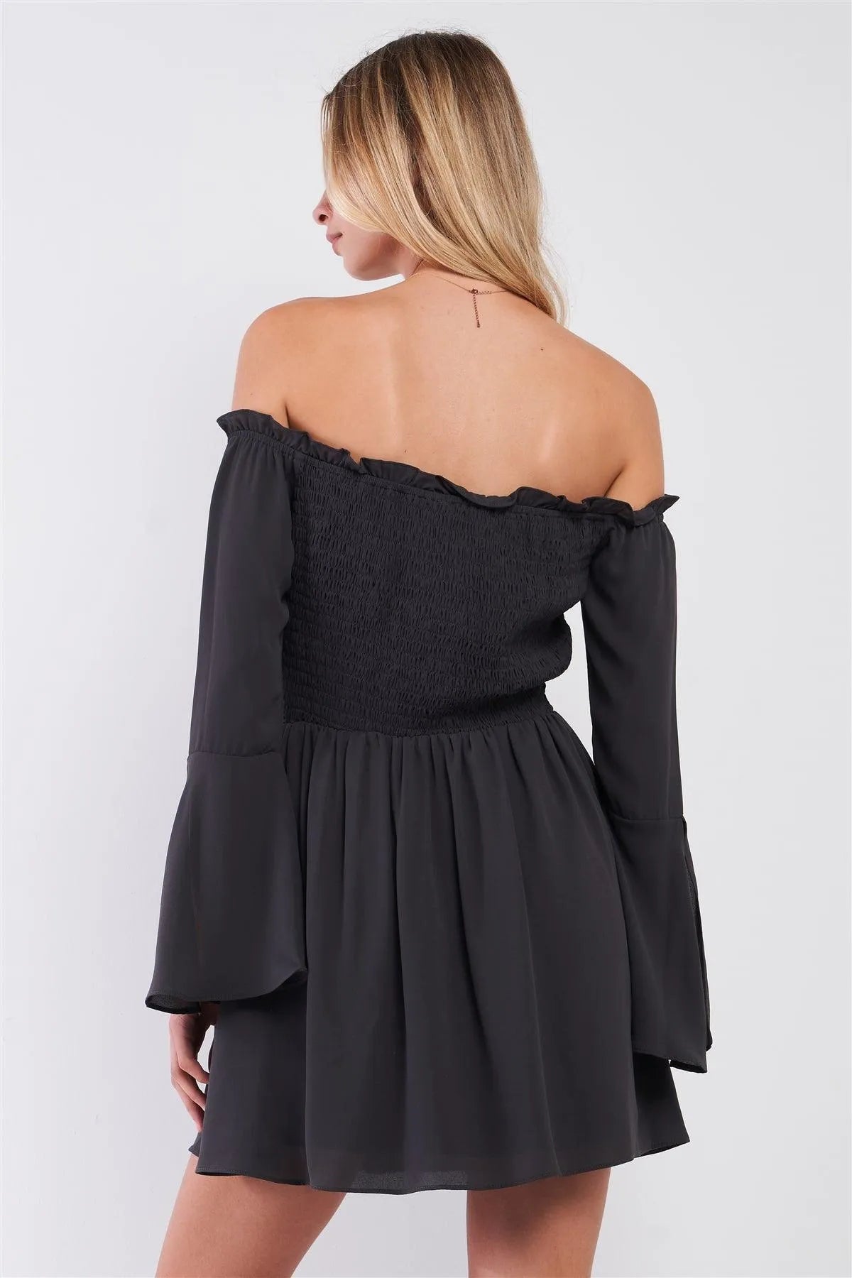 Charcoal Grey Frill Off-The-Shoulder Trumpet Sleeve Smock Flare Mini Dress /1-2-2-1