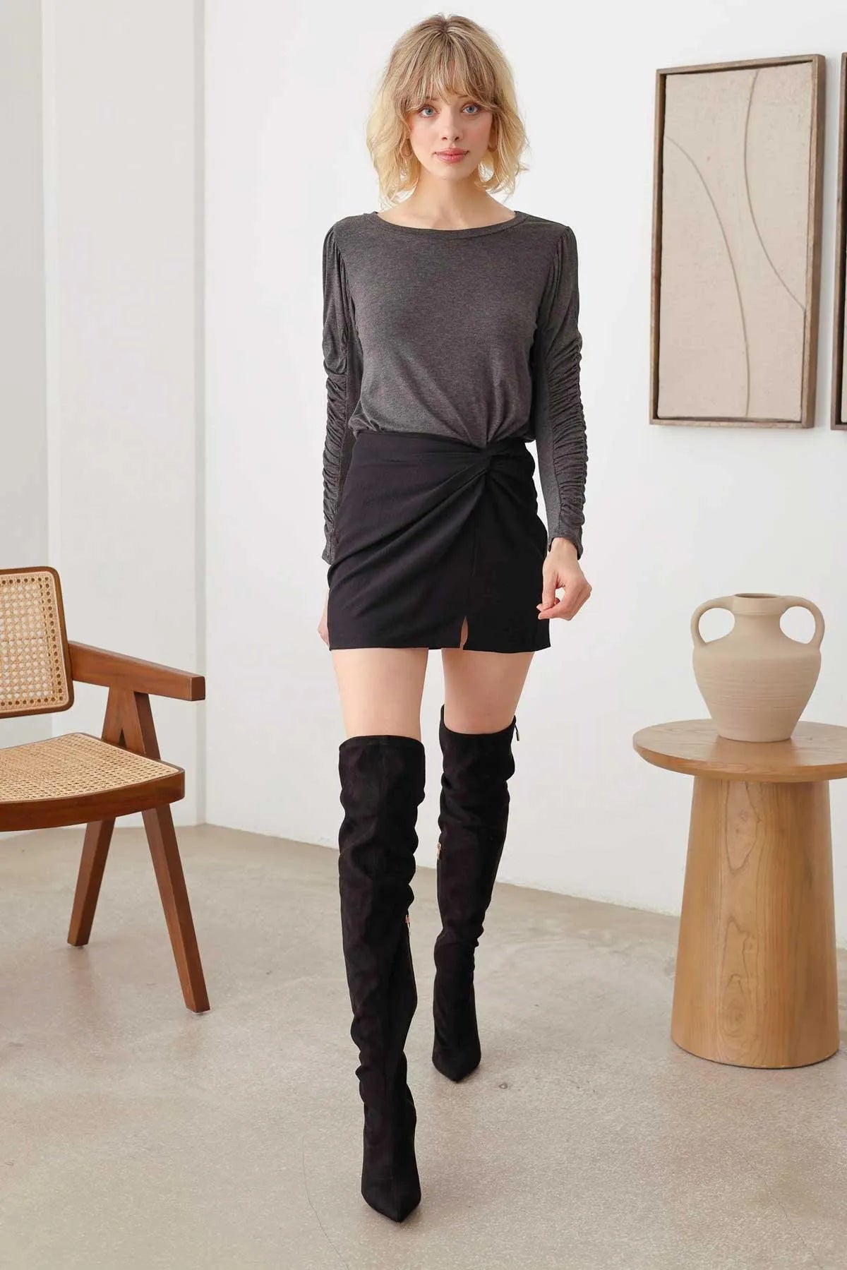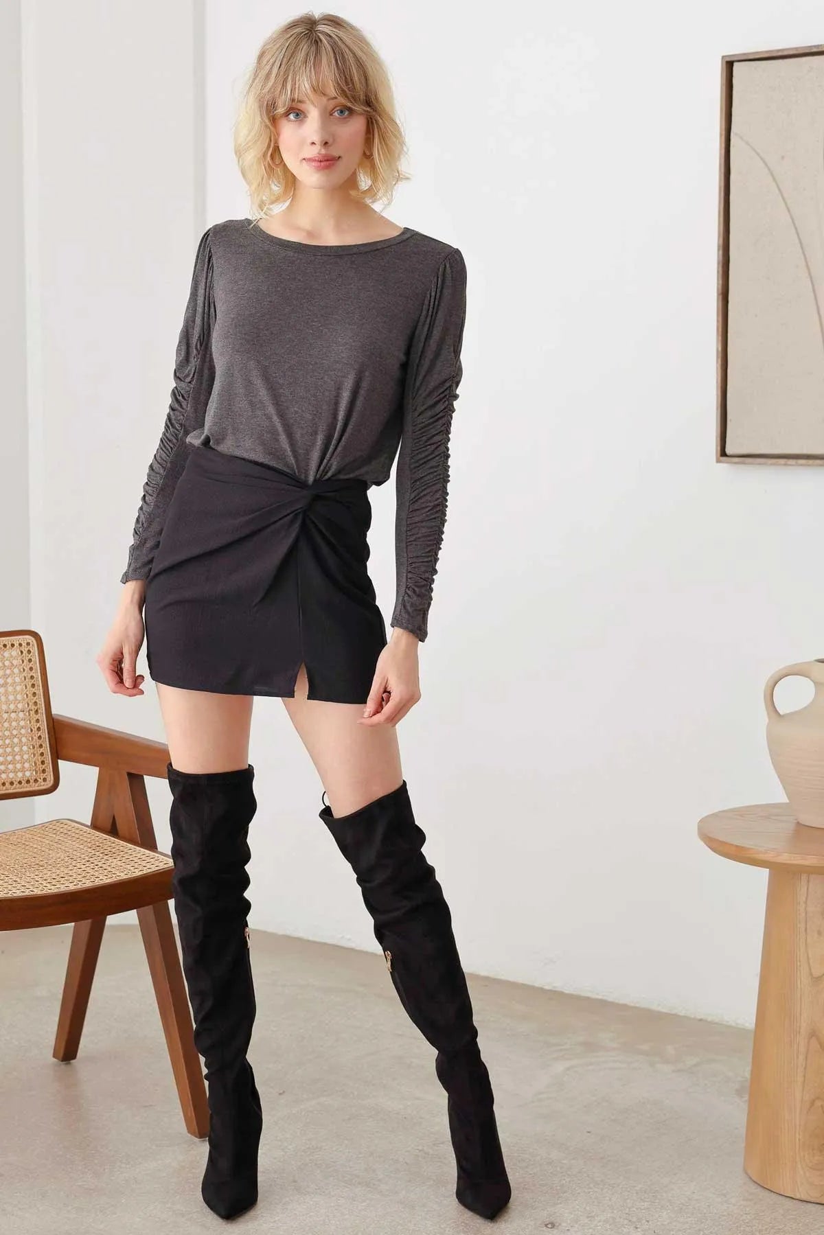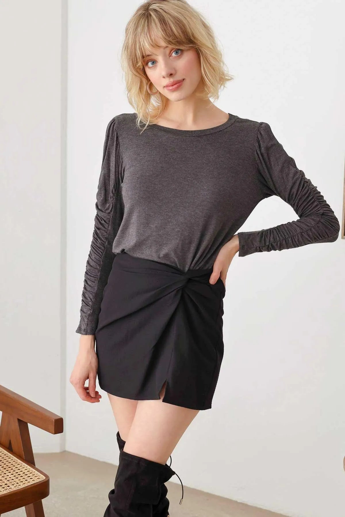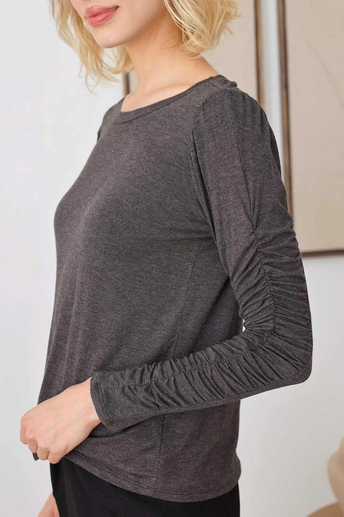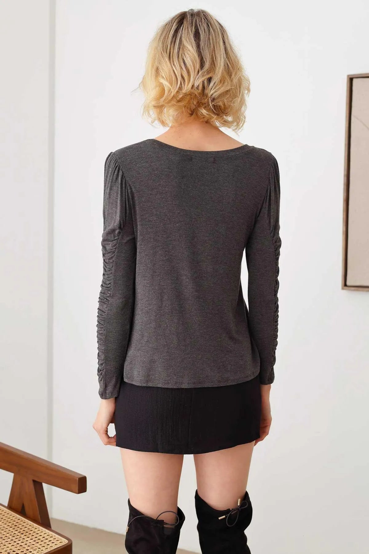 🖤 Item Features: Charcoal, solid color, ruched detail long sleeves, round neckline, unlined, stretchy, not see through, casual, cute, chic, trendy, stylish, must have.