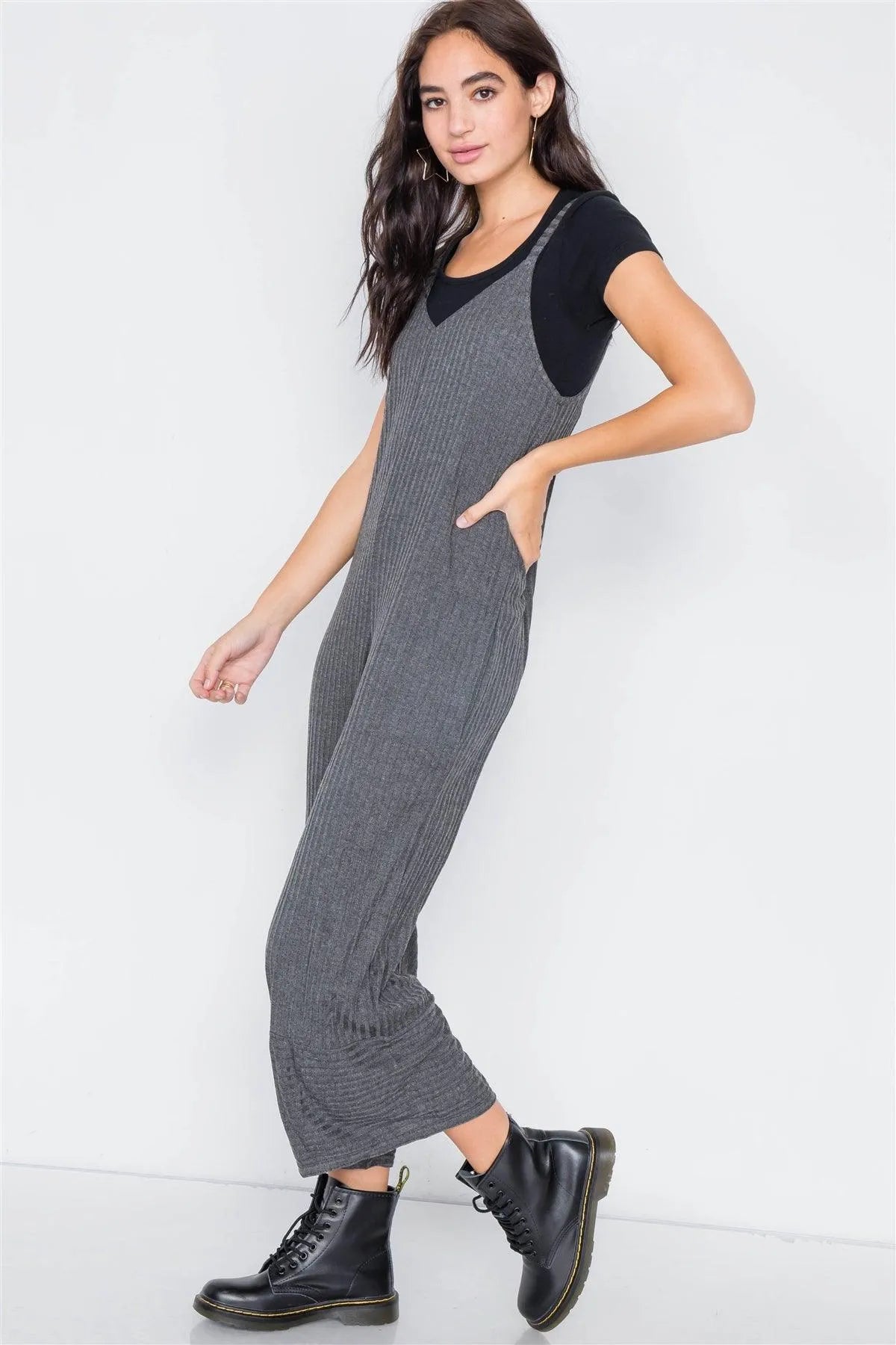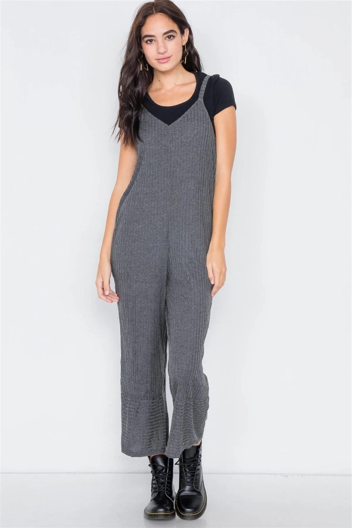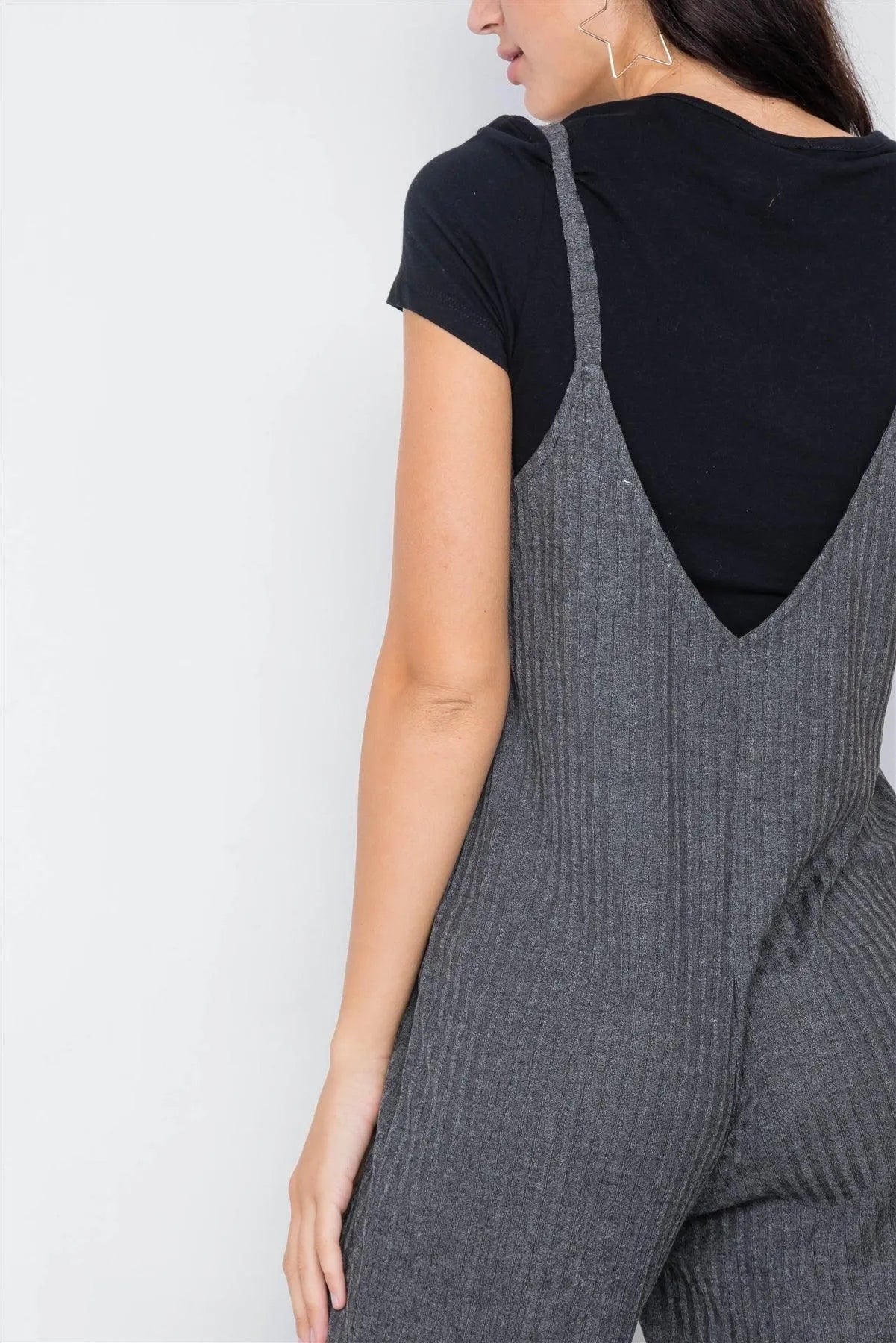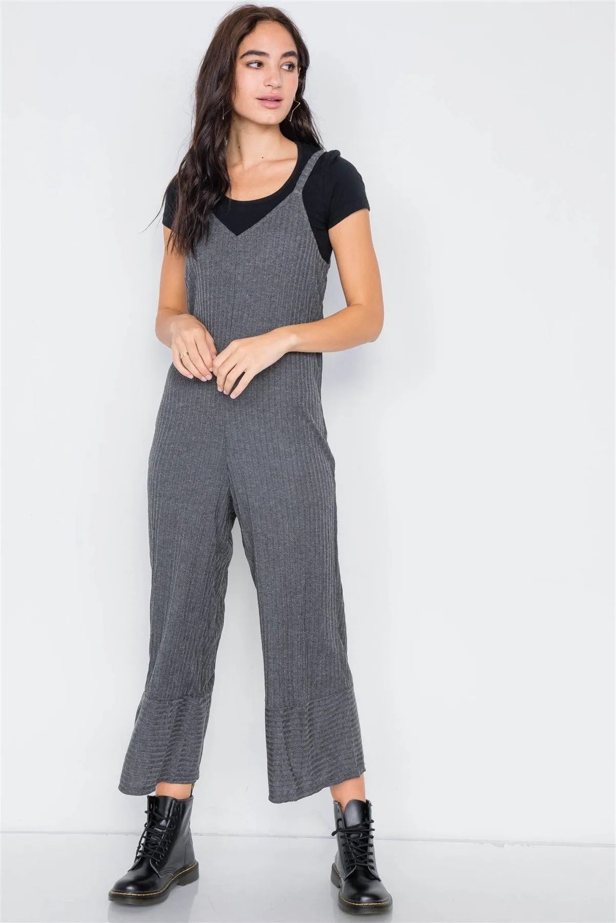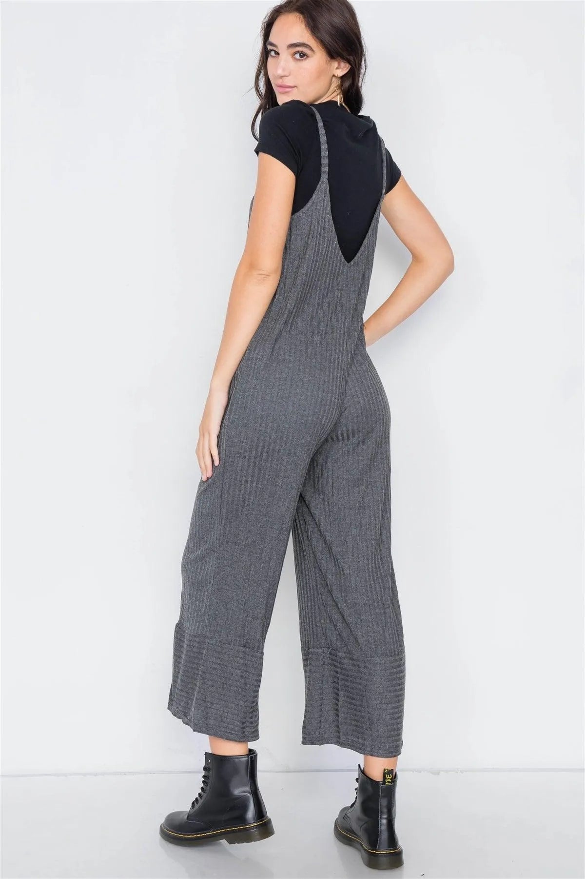 Charcoal V-Neck Ribbed Knit Gaucho Jumpsuit /3-2-1