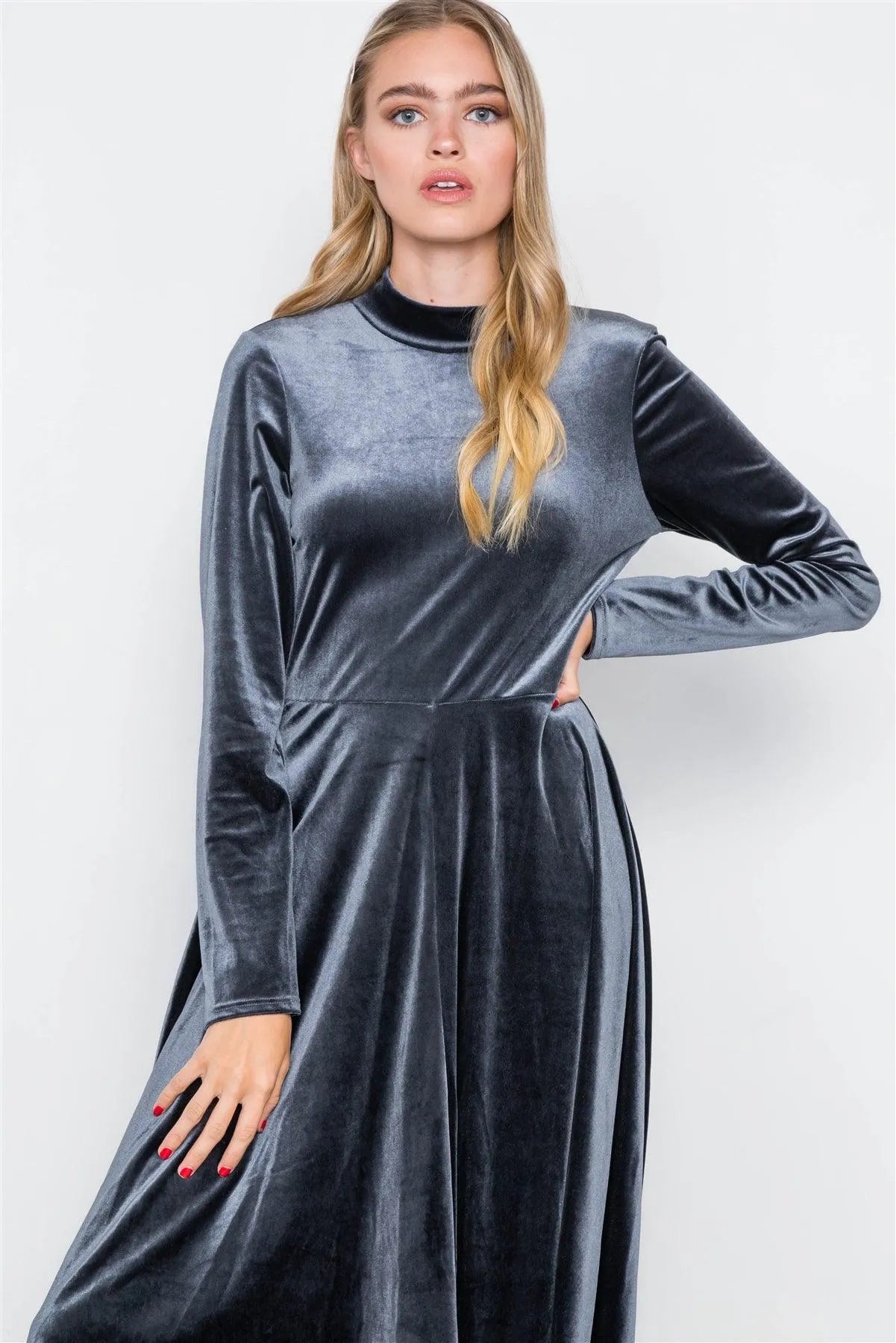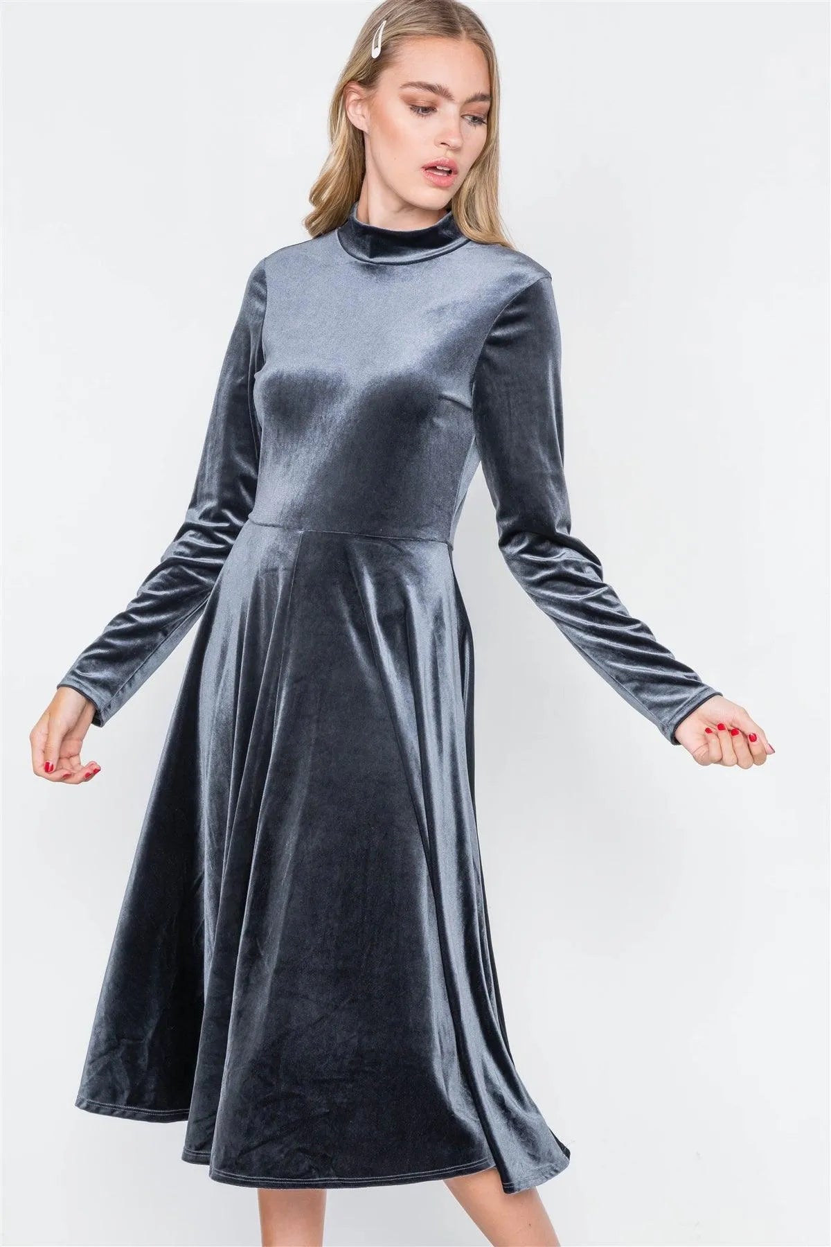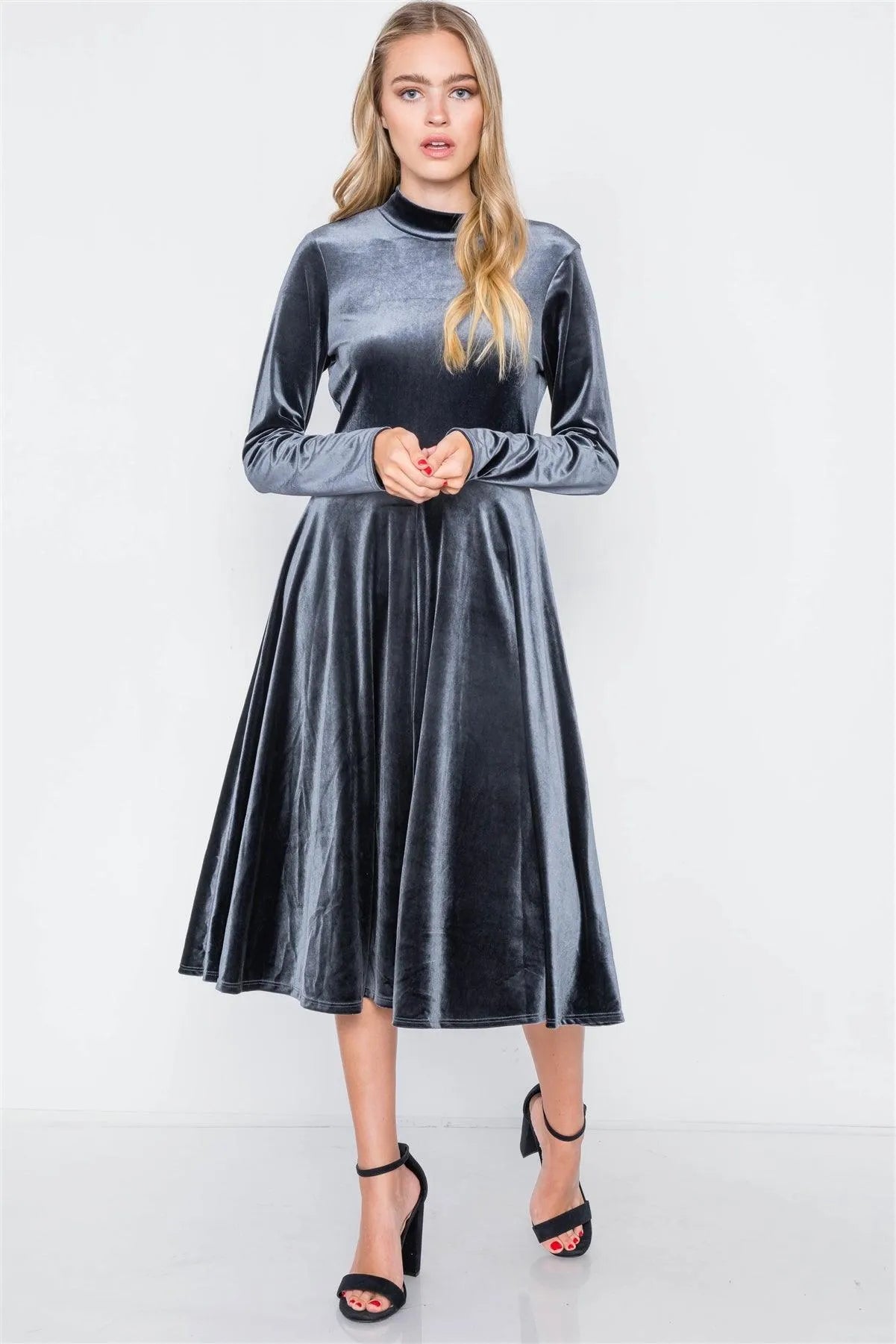 Charcoal Velvet Long Sleeve A-Line Midi Evening Dress