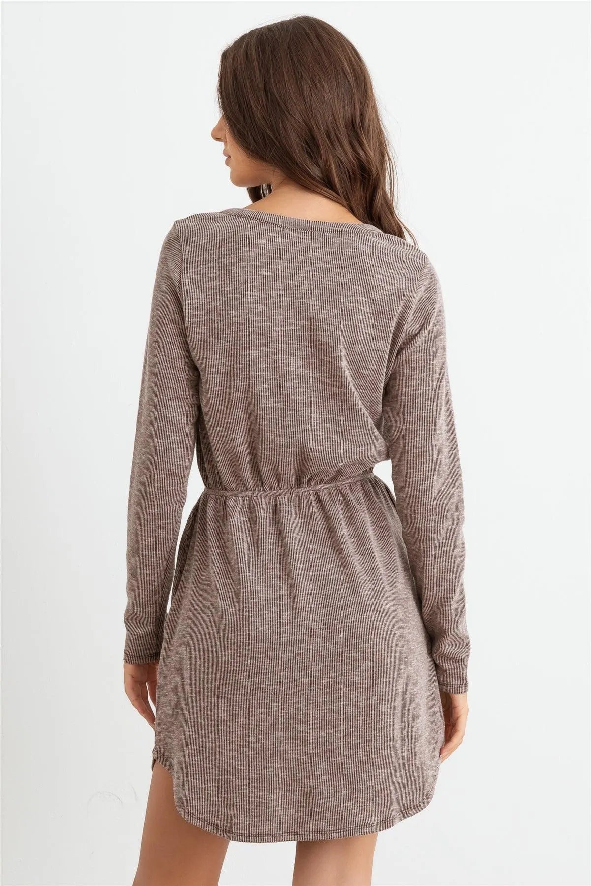 Chocolate Ribbed Button Neck Two Pocket Long Sleeve Mini Dress /1-2