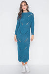 🖤 Wrap yourself in cozy comfort with our Teal Chunky Knit Long Sleeve Sweater Dress! Made with a chunky knit fabric, this dress features long sleeves, a round neck, and distressed detailing for a touch of edgy style. The midi length and slightly sheer design add a playful touch to this must-have piece.