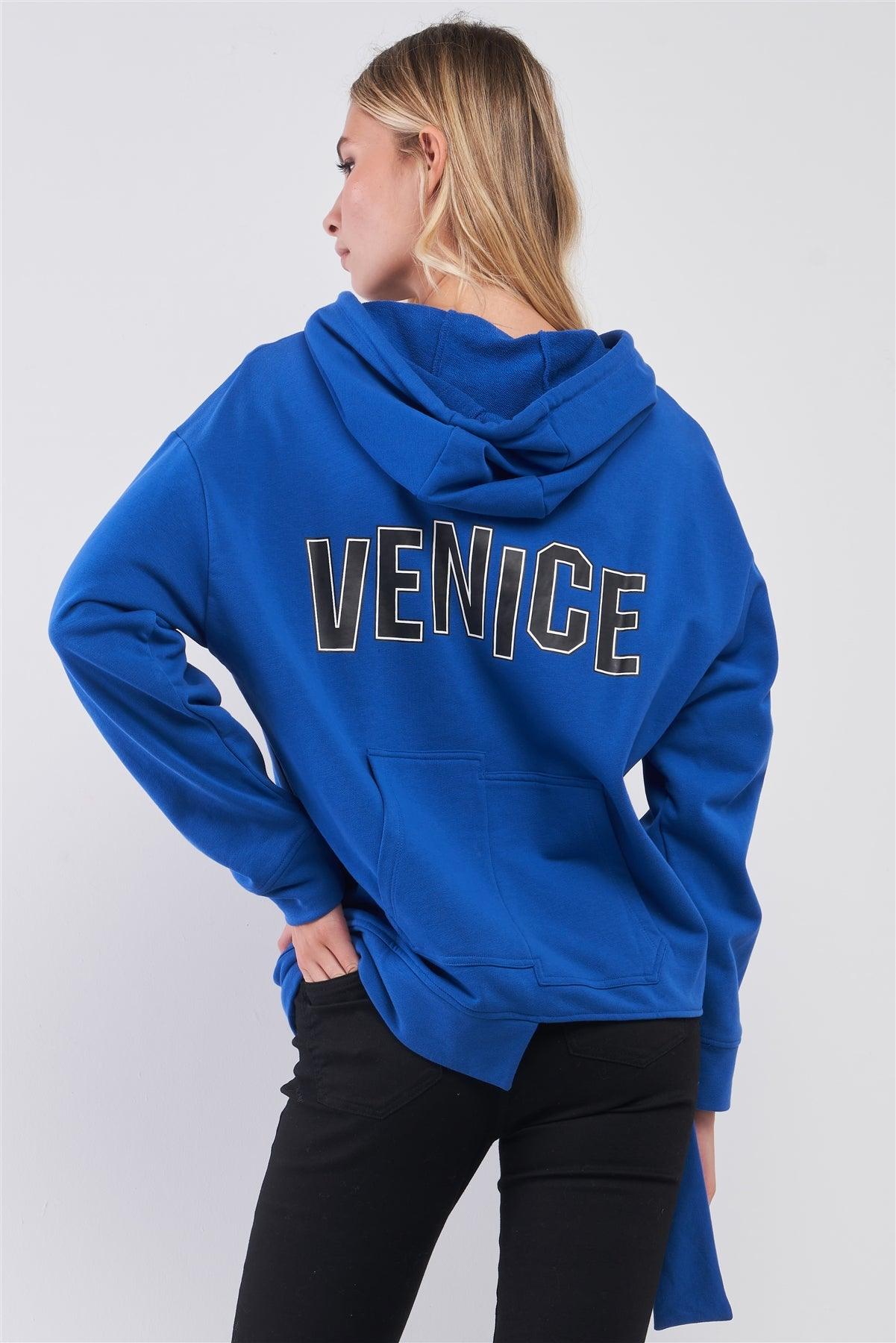 Cobalt Blue Oversized Uneven Hem Graphic "Venice" Pullover Hoodie Sweatshirt /3-2-1