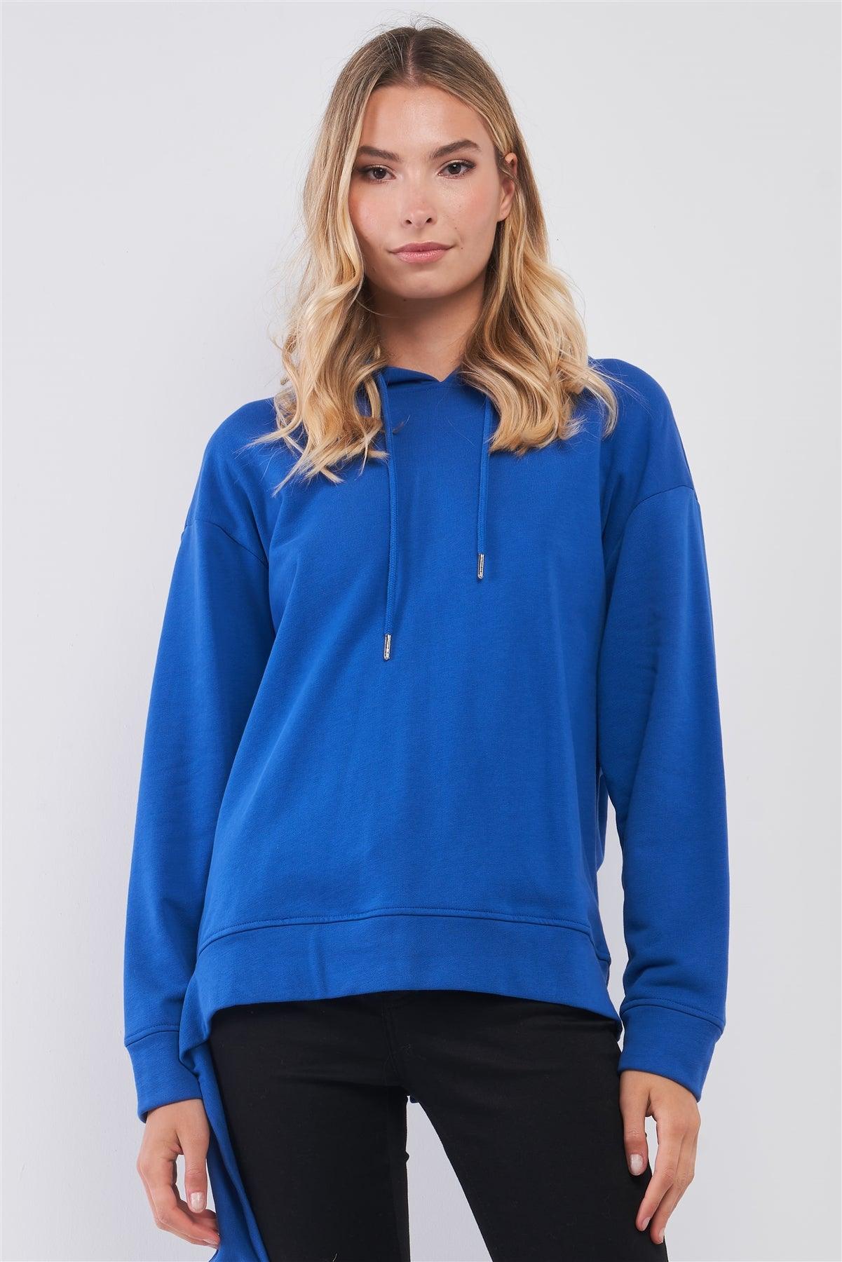 🖤 Item features: Cobalt blue, solid color, dropped shoulders, oversized, long sleeve, attached hood with drawstring, back pocket detail, black & white " Venice" text at the back, stretchy, casual, comfy, must-have, everyday wear