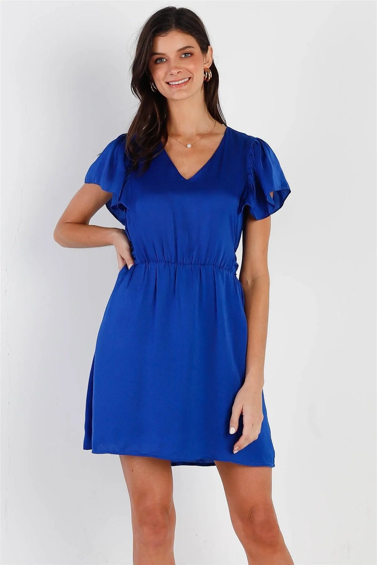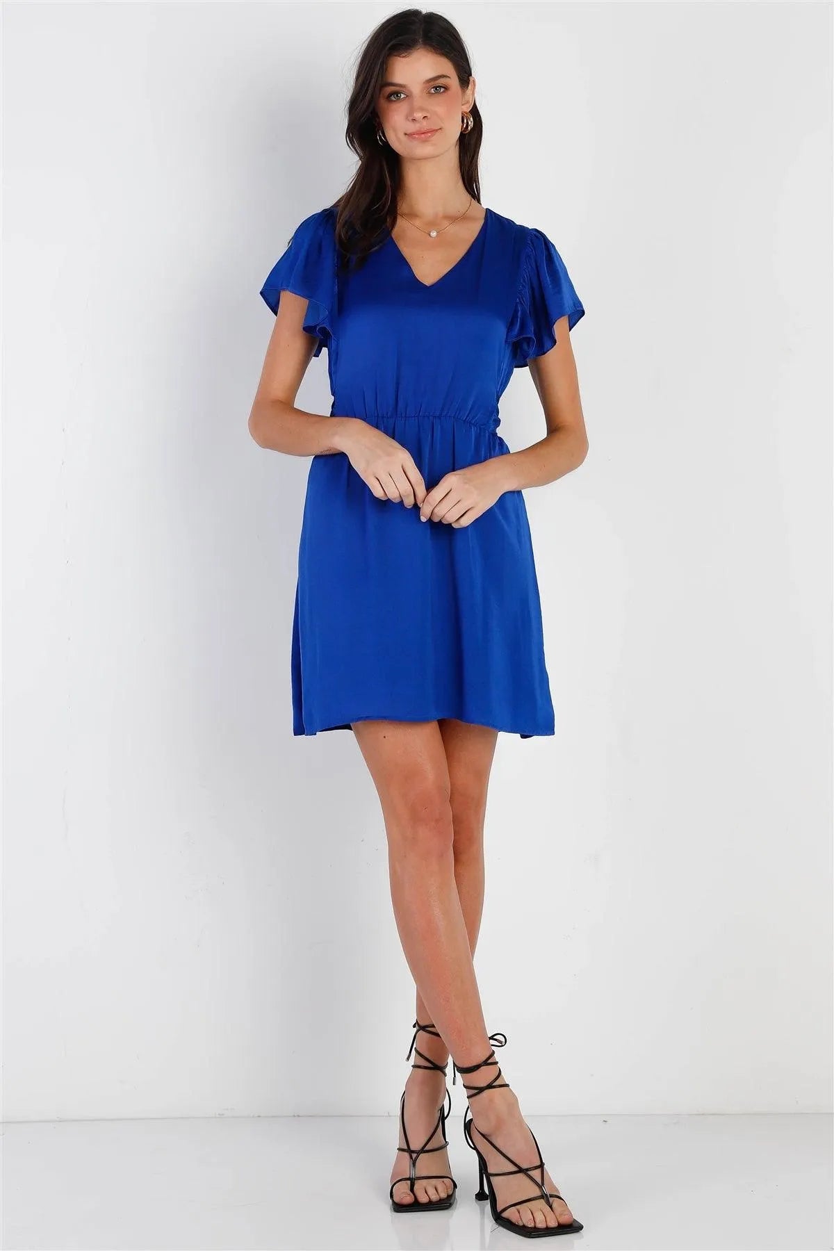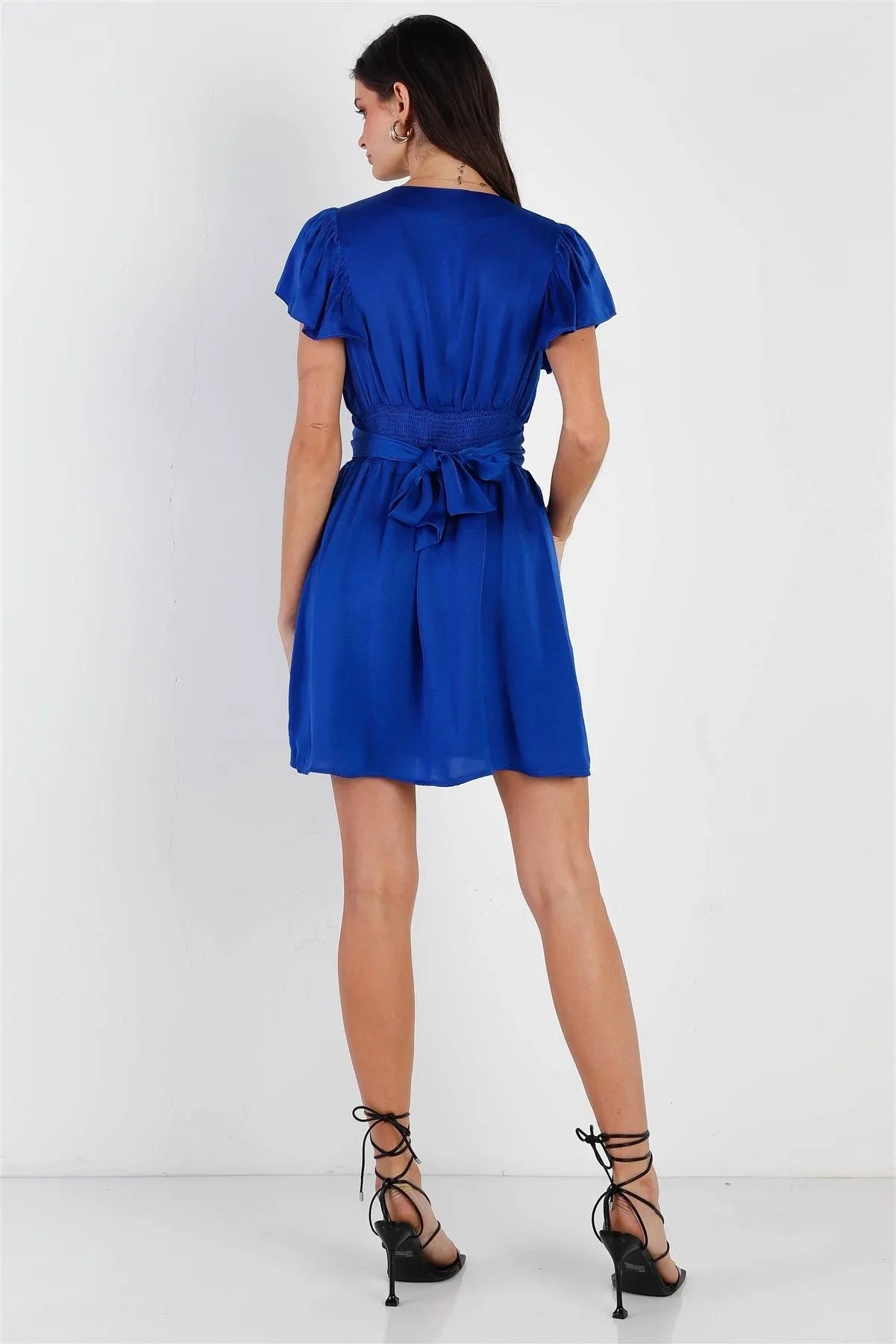 Cobalt Satin Effect Back Self-Tie Detail Flare Short Sleeve Mini Dress /1-2-2-1