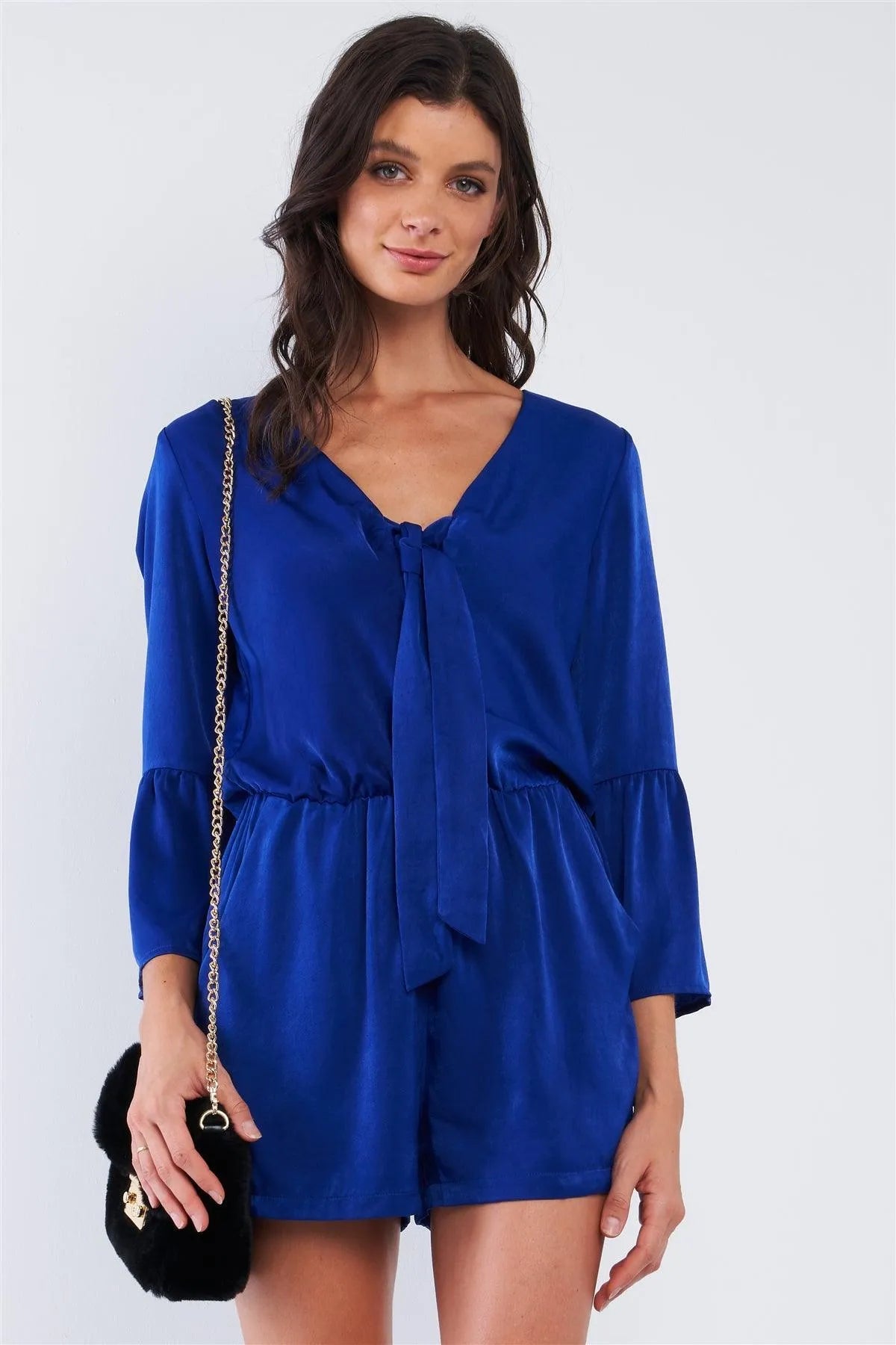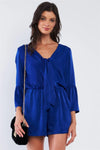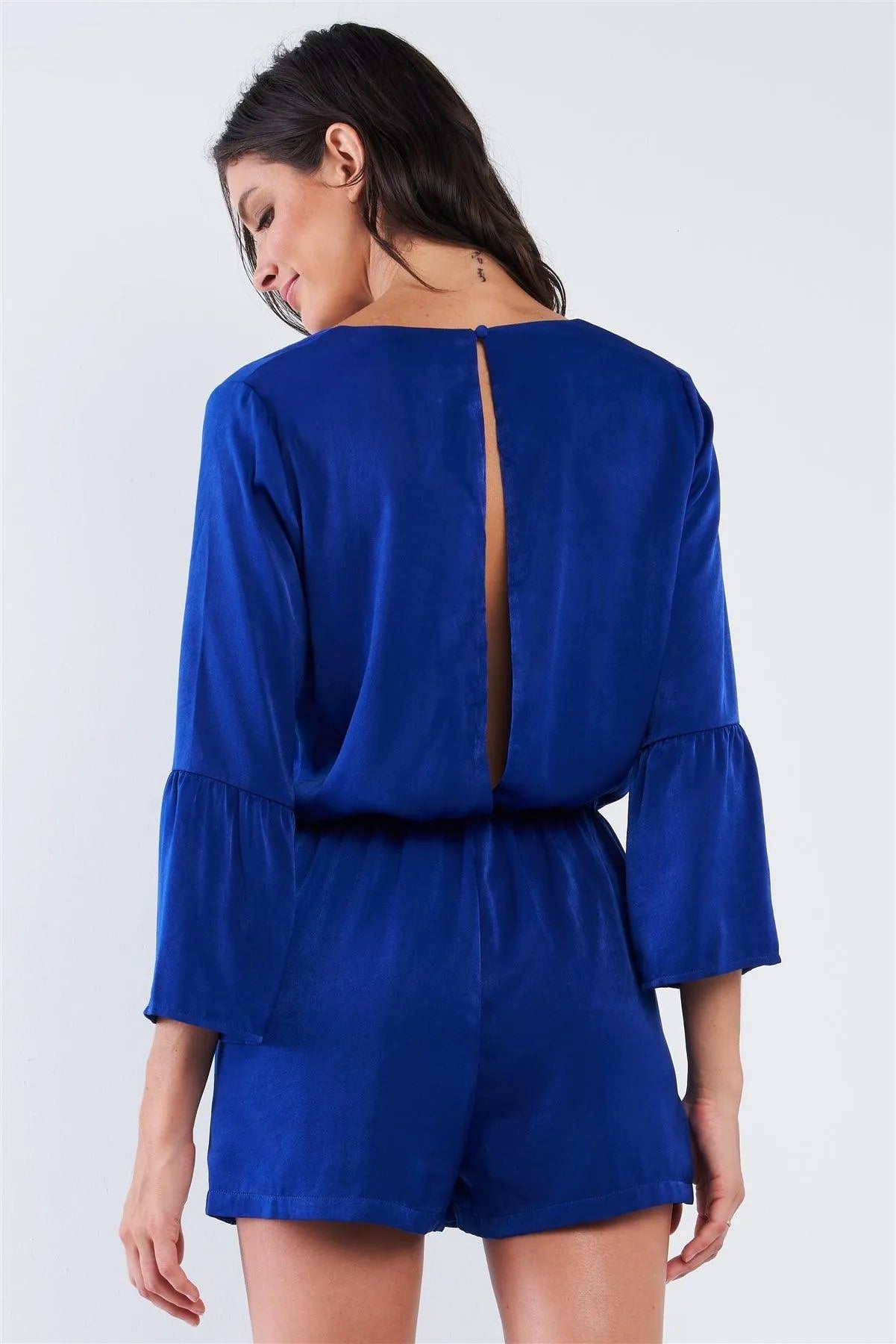 Cobalt Blue Satin Deep Plunge Self-Tie V-Neck Button Down Long Bluebell Sleeve Romper /2-2-2-1