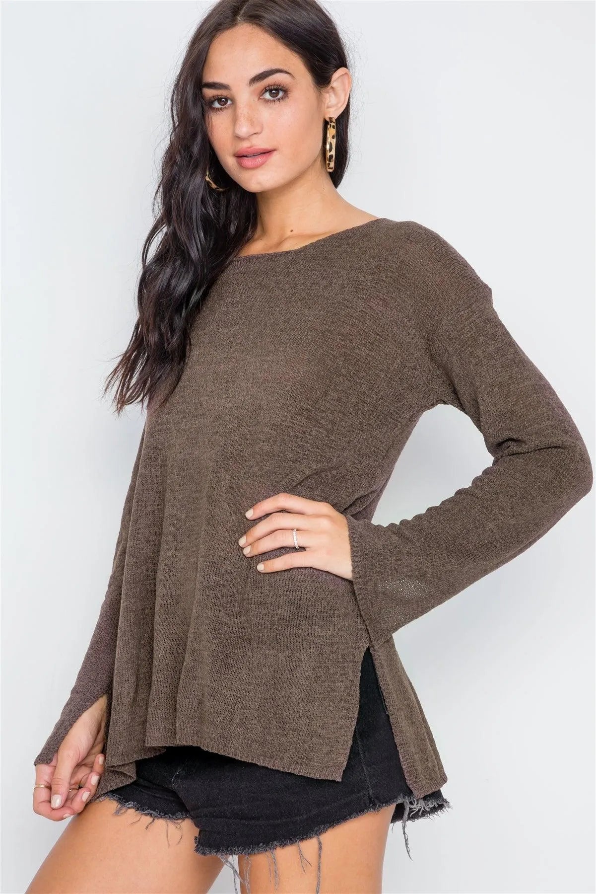 Sweater features: long sleeves with slits at cuffs, scoop-neck, dropped shoulders, side slits, slightly sheerModel is 5'9 wearing a size Small ( Waist: 24", Bust: 32A, Hips: 34")Small Size Item Measurements: Length: 31", Bust: 46" Sleeves: 20.5"True to size
