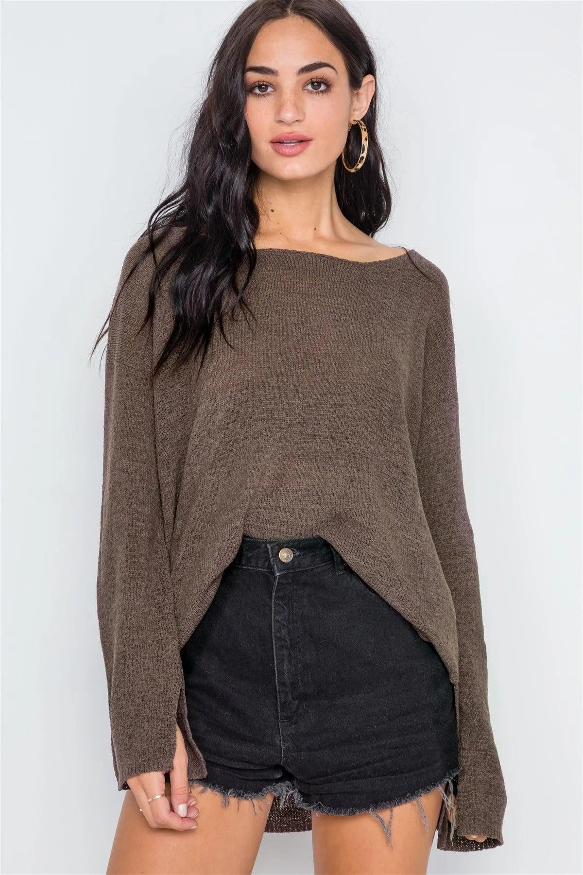 Sweater features: long sleeves with slits at cuffs, scoop-neck, dropped shoulders, side slits, slightly sheerModel is 5'9 wearing a size Small ( Waist: 24", Bust: 32A, Hips: 34")Small Size Item Measurements: Length: 31", Bust: 46" Sleeves: 20.5"True to size