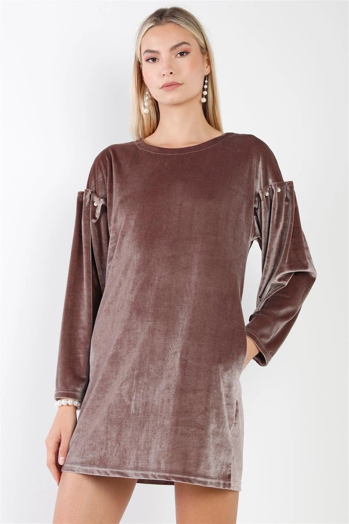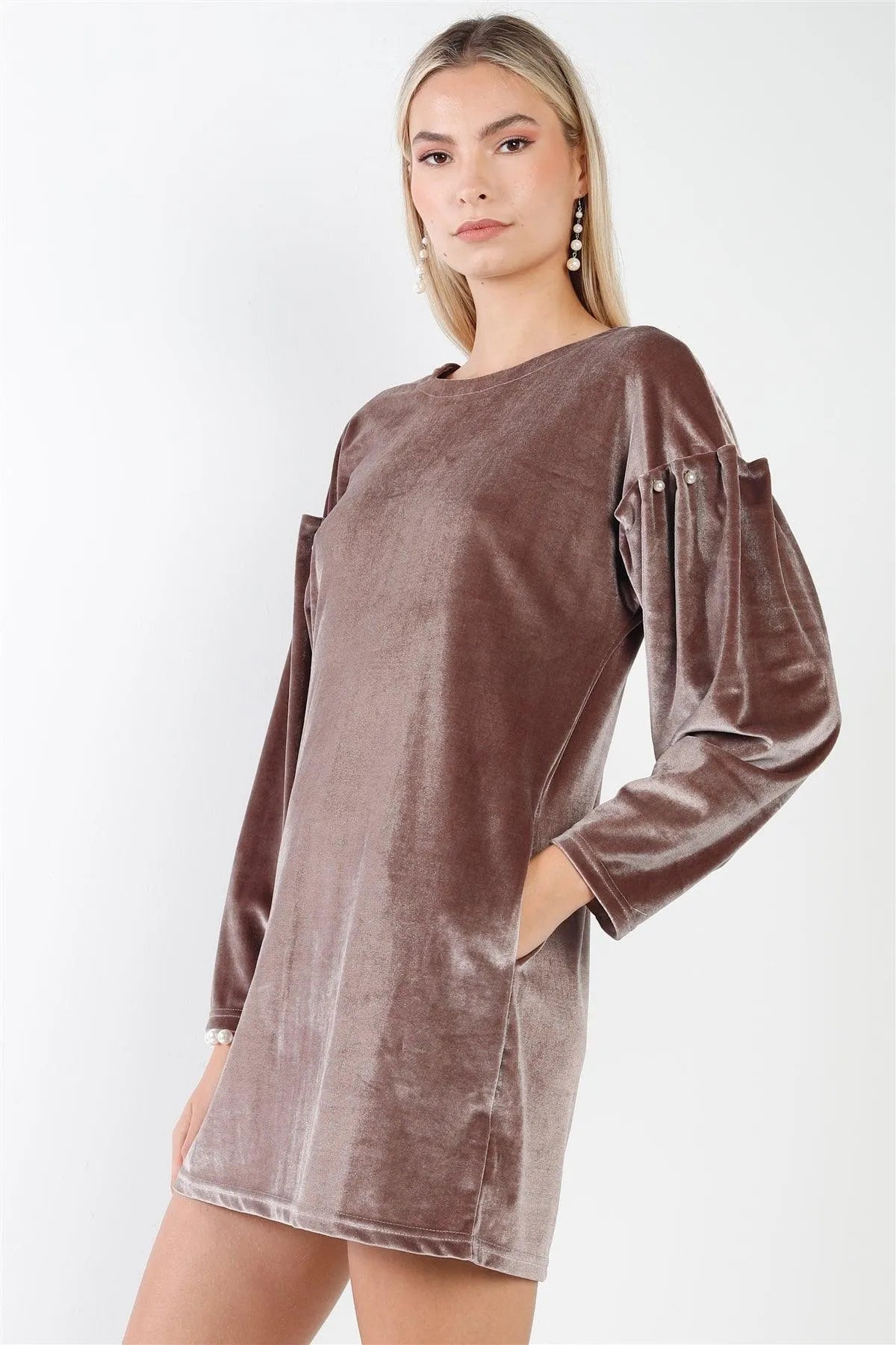 Cocoa Velvet Long Sleeve Pearl Detail Mini Dress /2-2-2