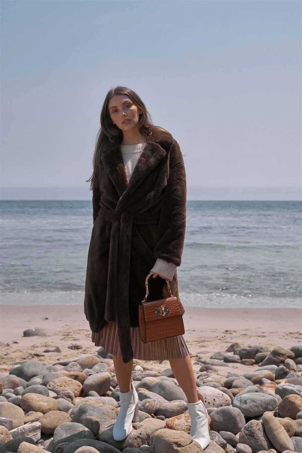 Dark Coffee Soft Faux Fur Open Front Detachable Belt Long Sleeve Coat /2-2-2