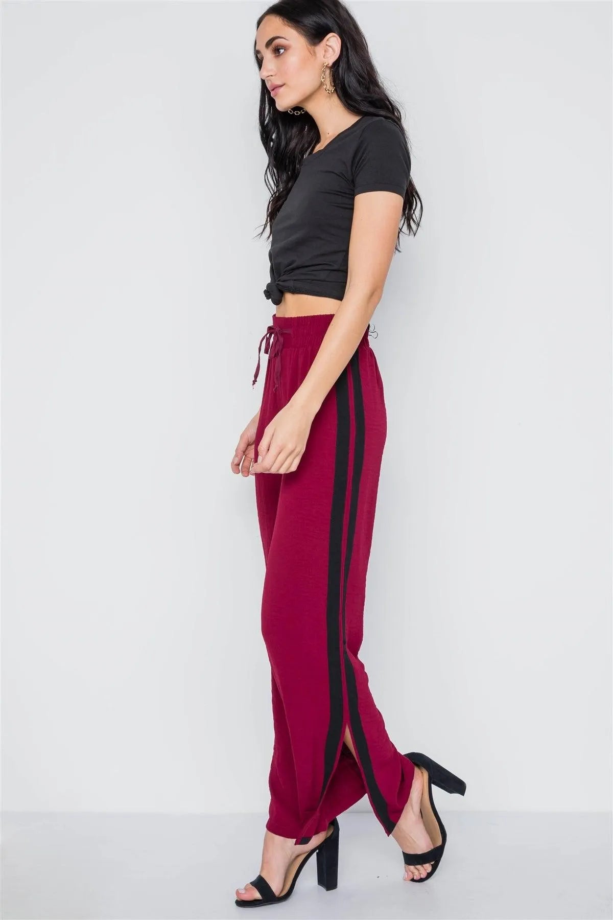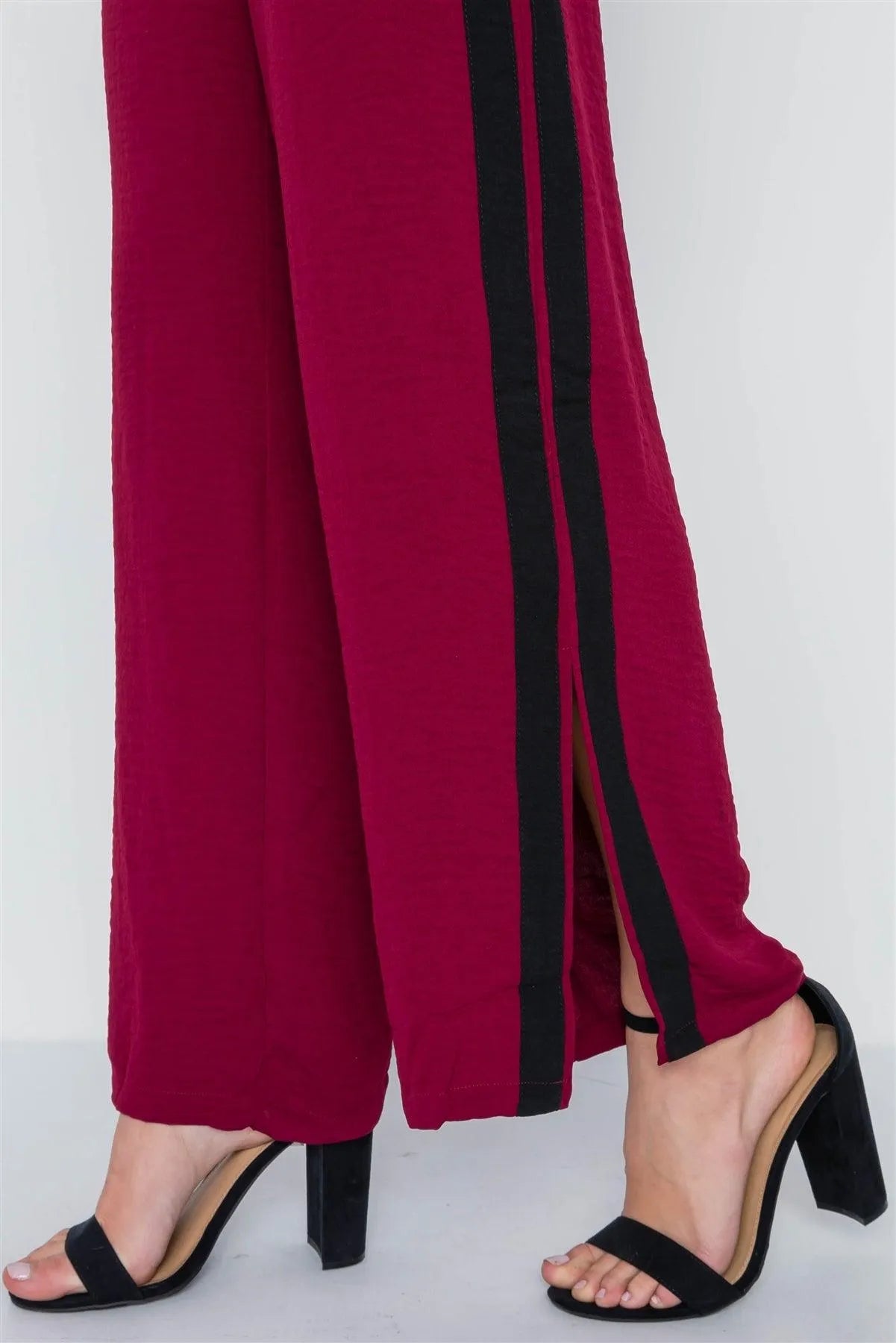 Wine Contrast Trim Side Slit Wide Leg Casual Pants /2-2-1