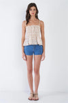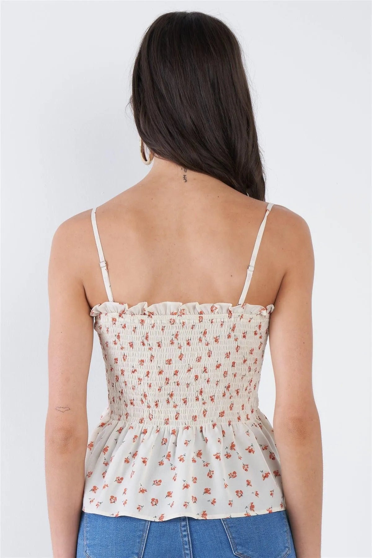 Cream Beige Boho Floral Square Neck Sheer Peplum Top /4-2-1