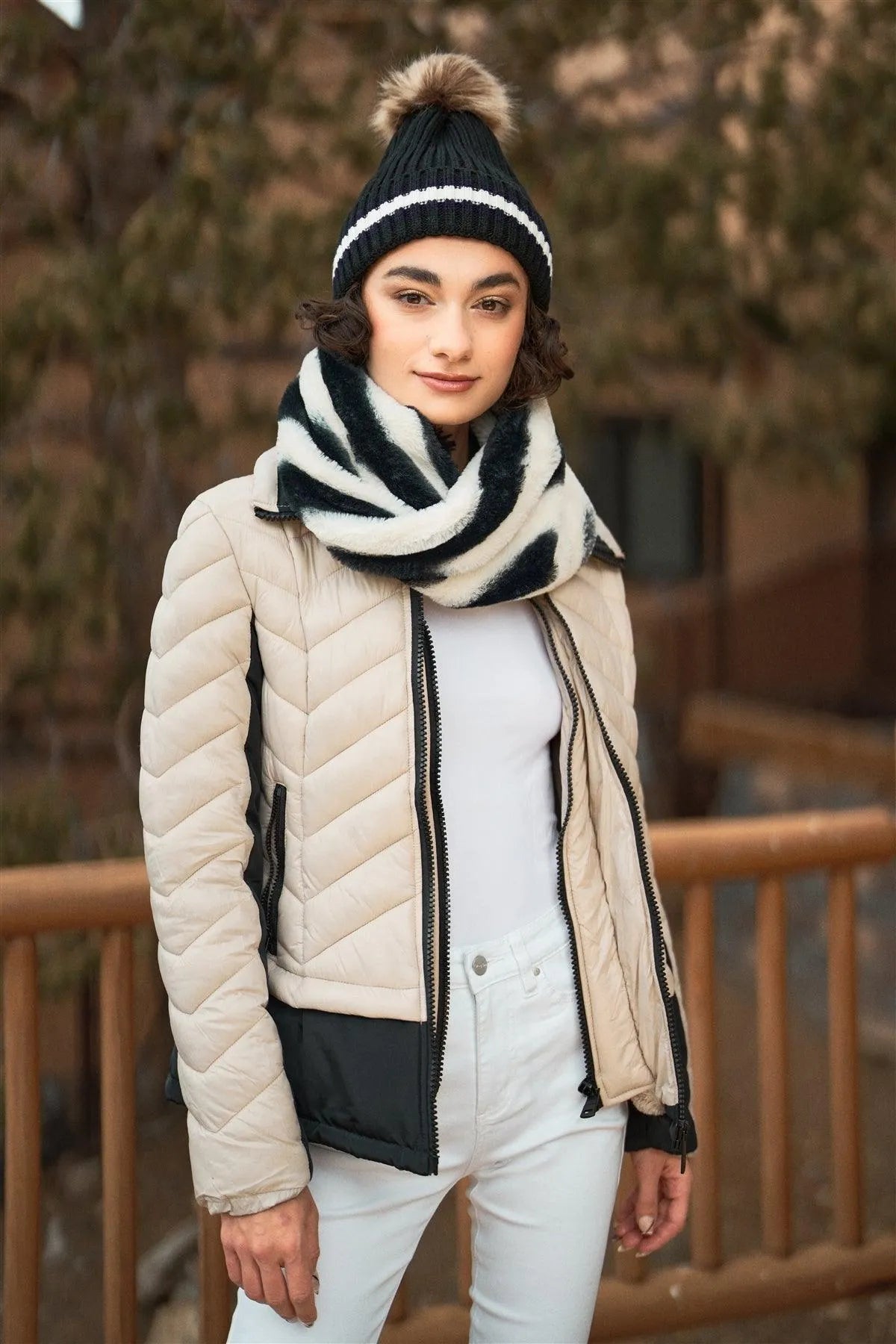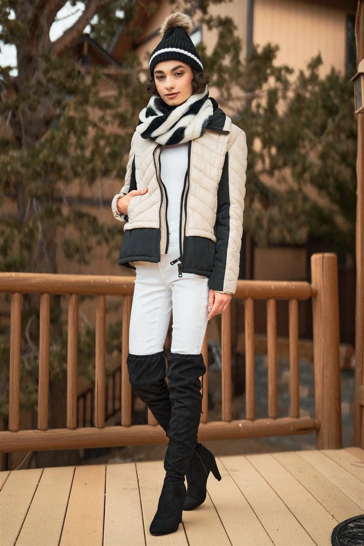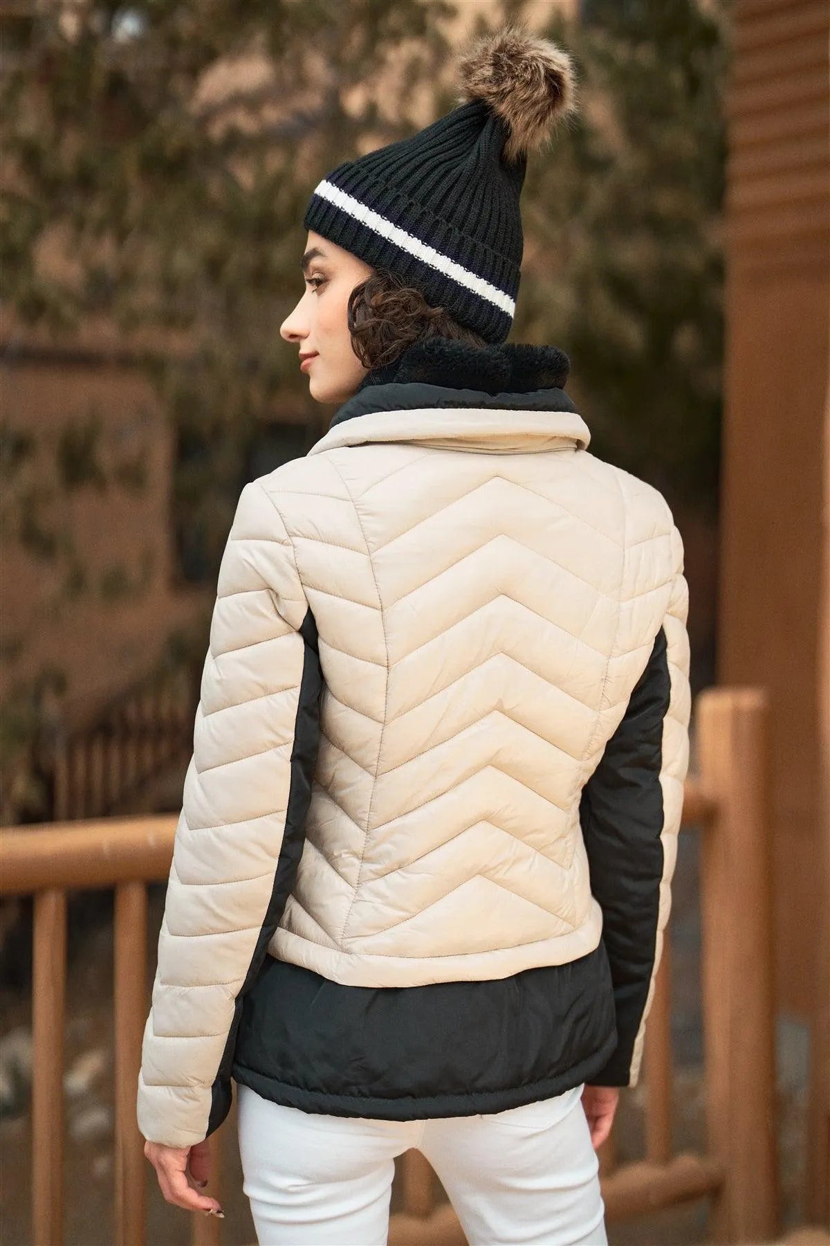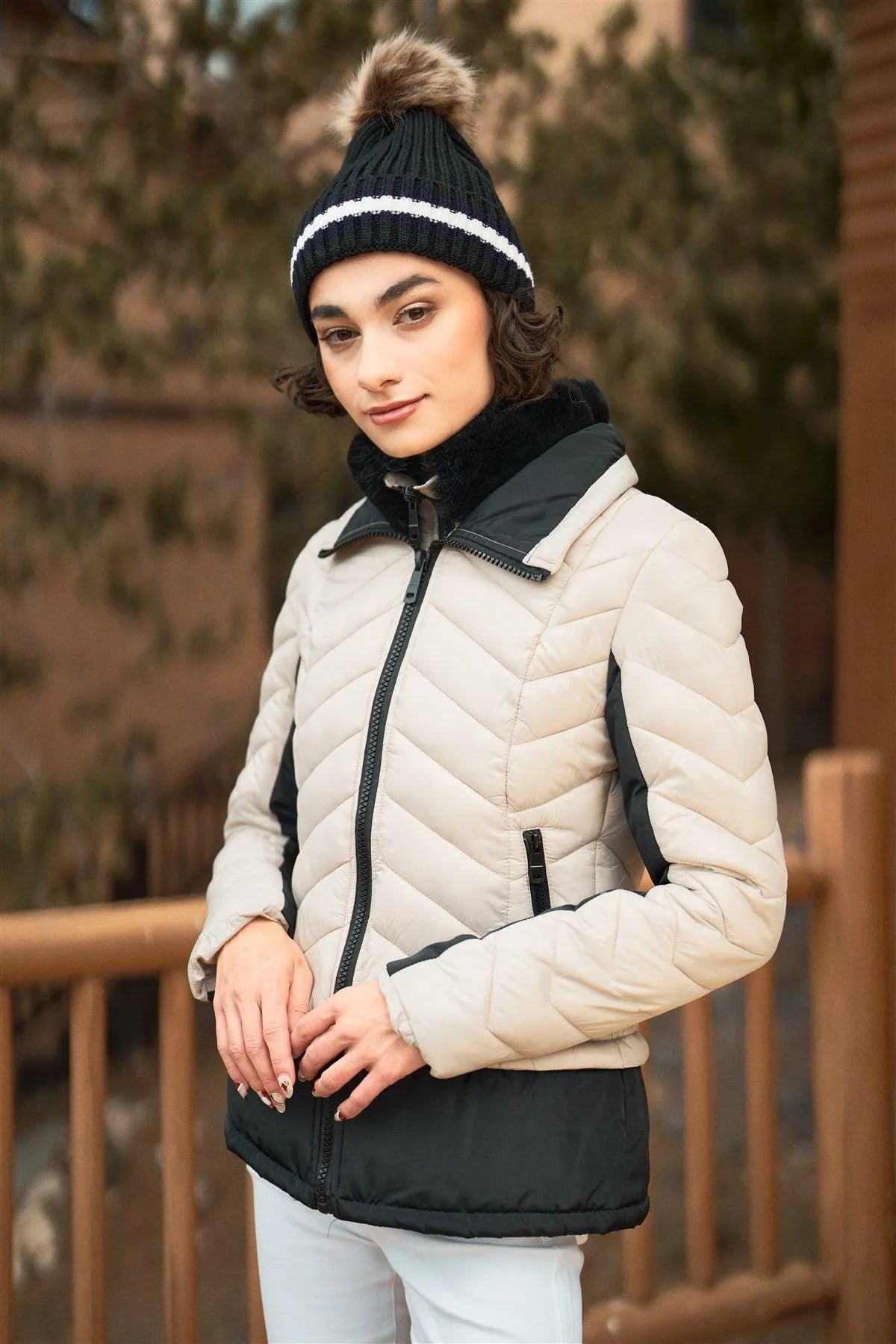 🖤 Item Features: Cream& black, puffer jacket, combined, long sleeve, black contrast details on sleeves and hem, high neck lined fuzzy faux fur for extra warm, chevron quilted padded design, front double zip-up, side zipper pockets, regular length, non-stretch, fitted, winter sports attire, trendy design, activewear, snowboard and skiing outfit, cute and comfy