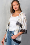 Kimono features: short sleeve, eyelash lace trim at sleeves back & hem, open neckline, open front, no closure, unlined, semi-sheer, no collar.Model is 5'9" and wearing a Small (Waist 26", Bust 34A", Hips 37")Item measurements: Length: 29'', Sleeve Length: 11.5"