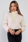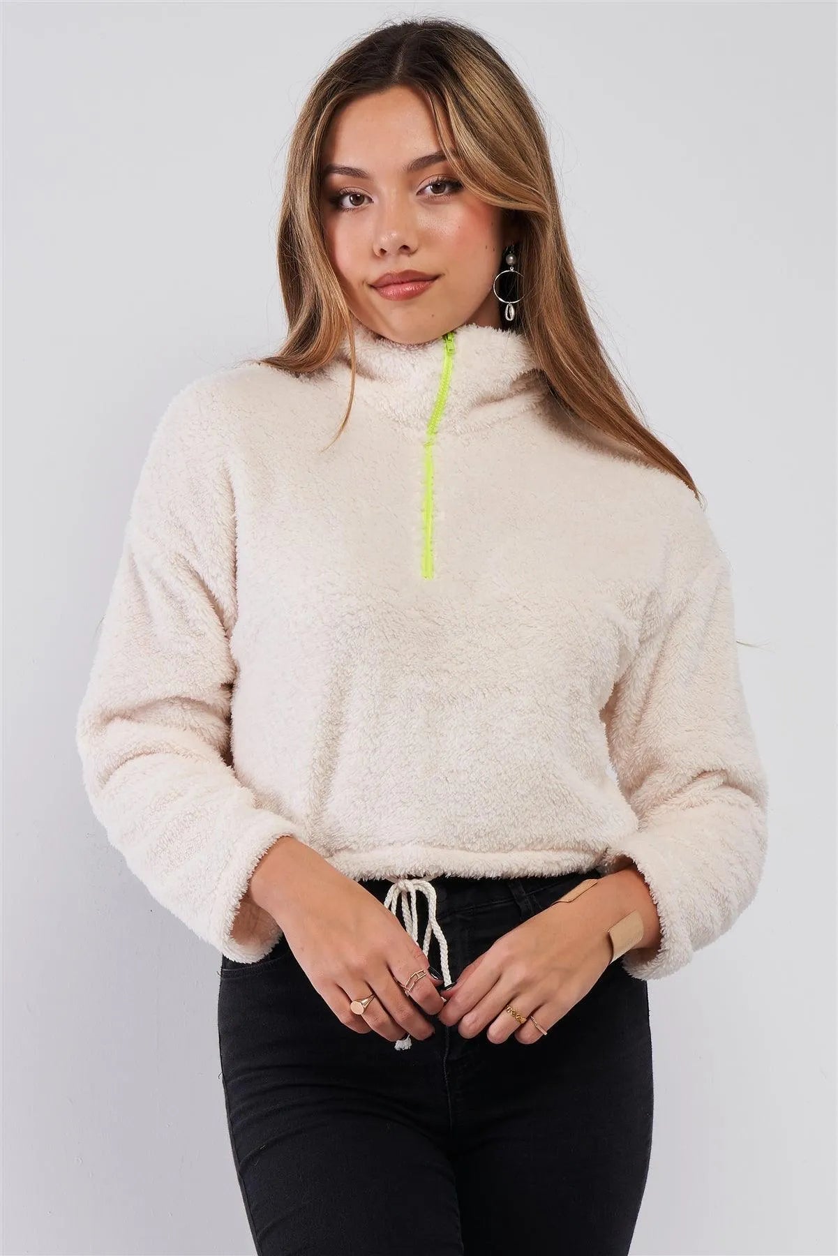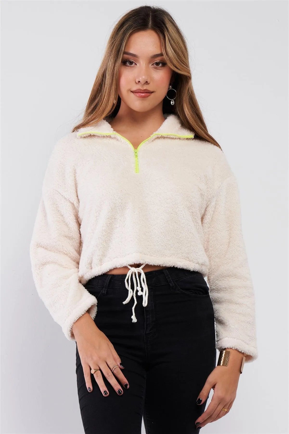 Cream Soft Plush Collared Neon Yellow Zip-Up Neckline Detail Relaxed Fit Crop Sweater /3-2-1