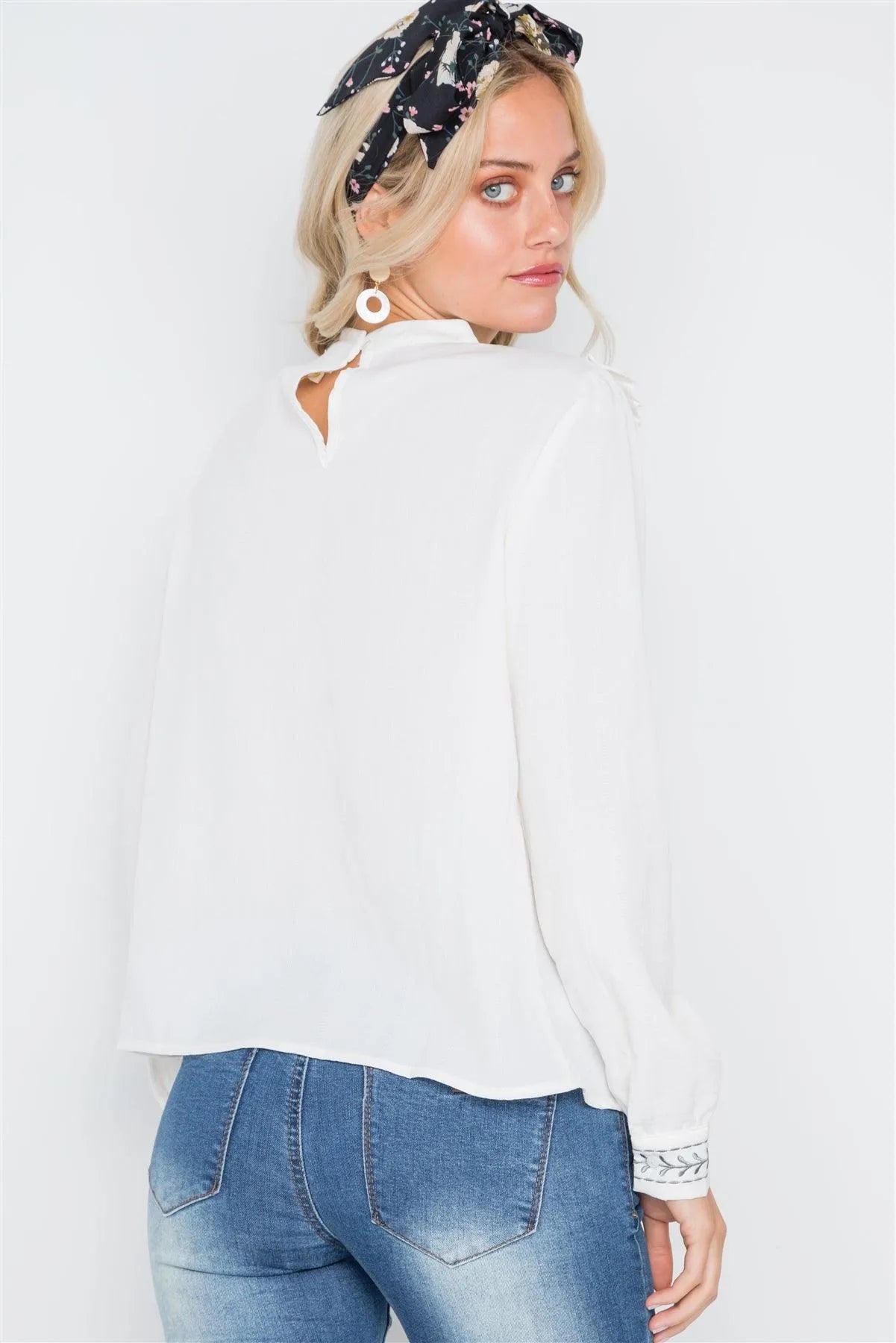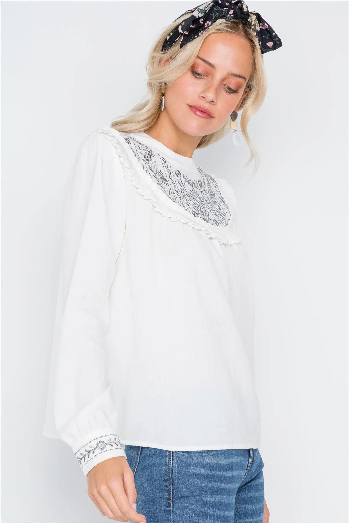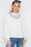 Cream Floral Embroidery Long Sleeve Boho Top /2-2-2