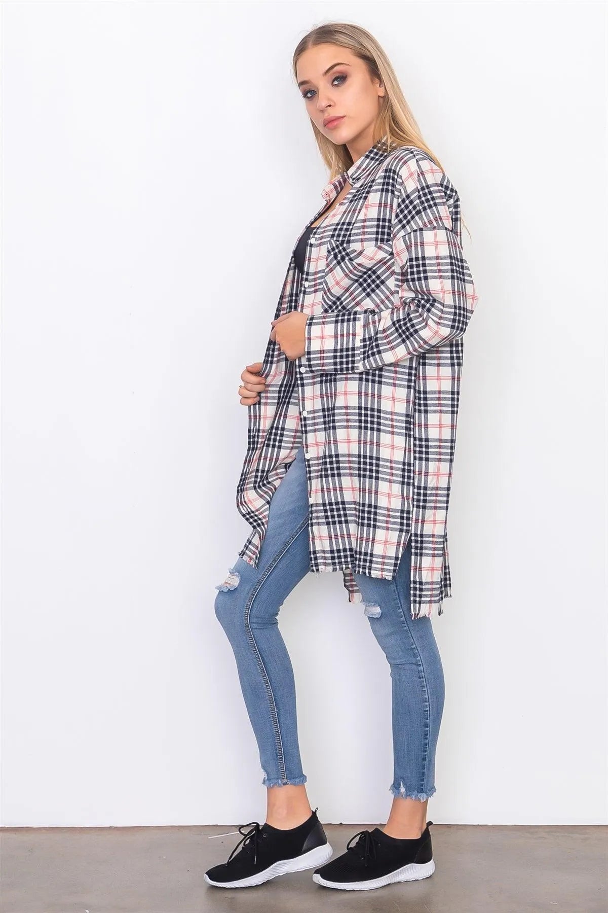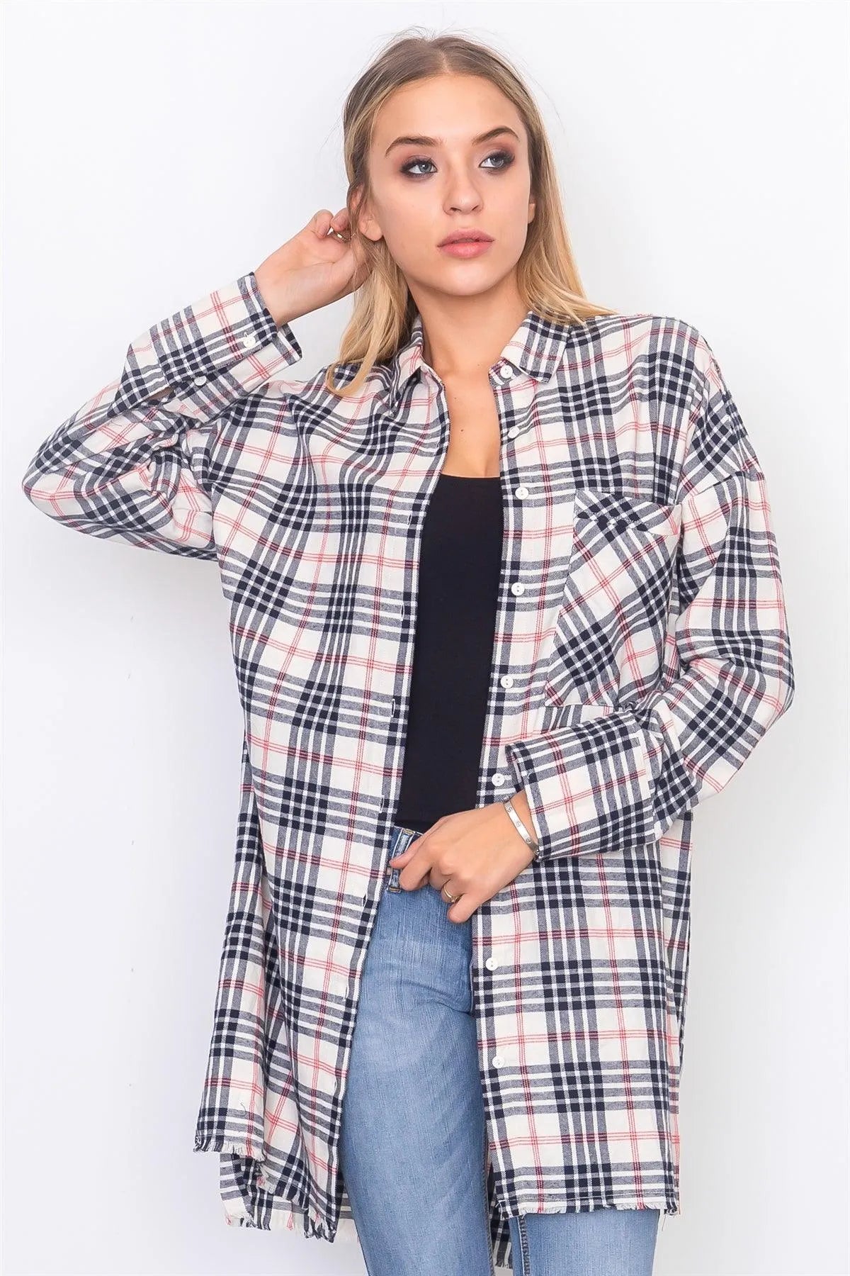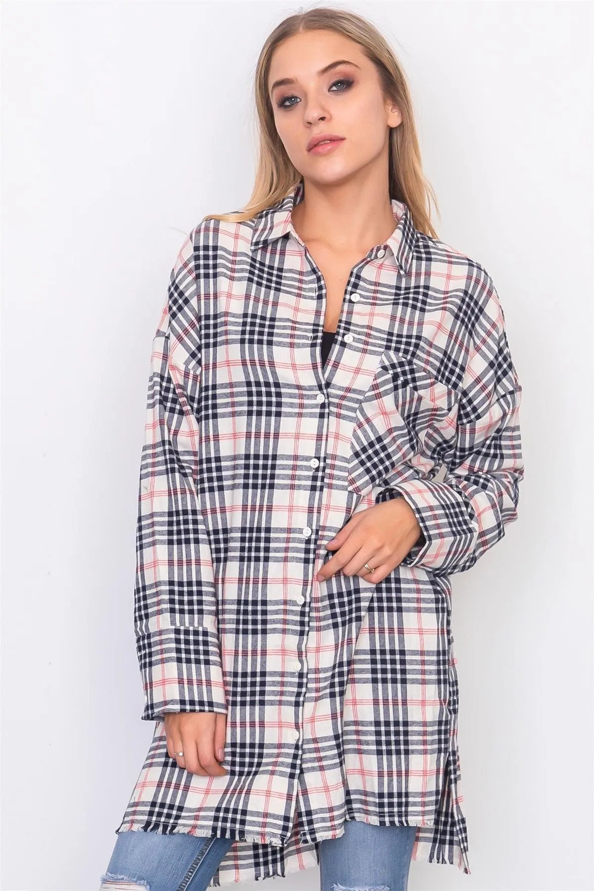 Cream Frayed Hem Plaid Button Down Shirt Dress /3-2-1