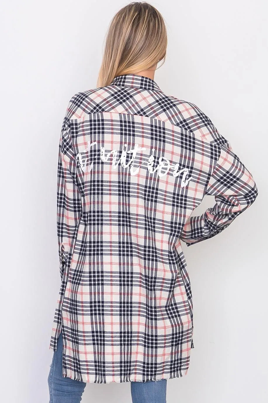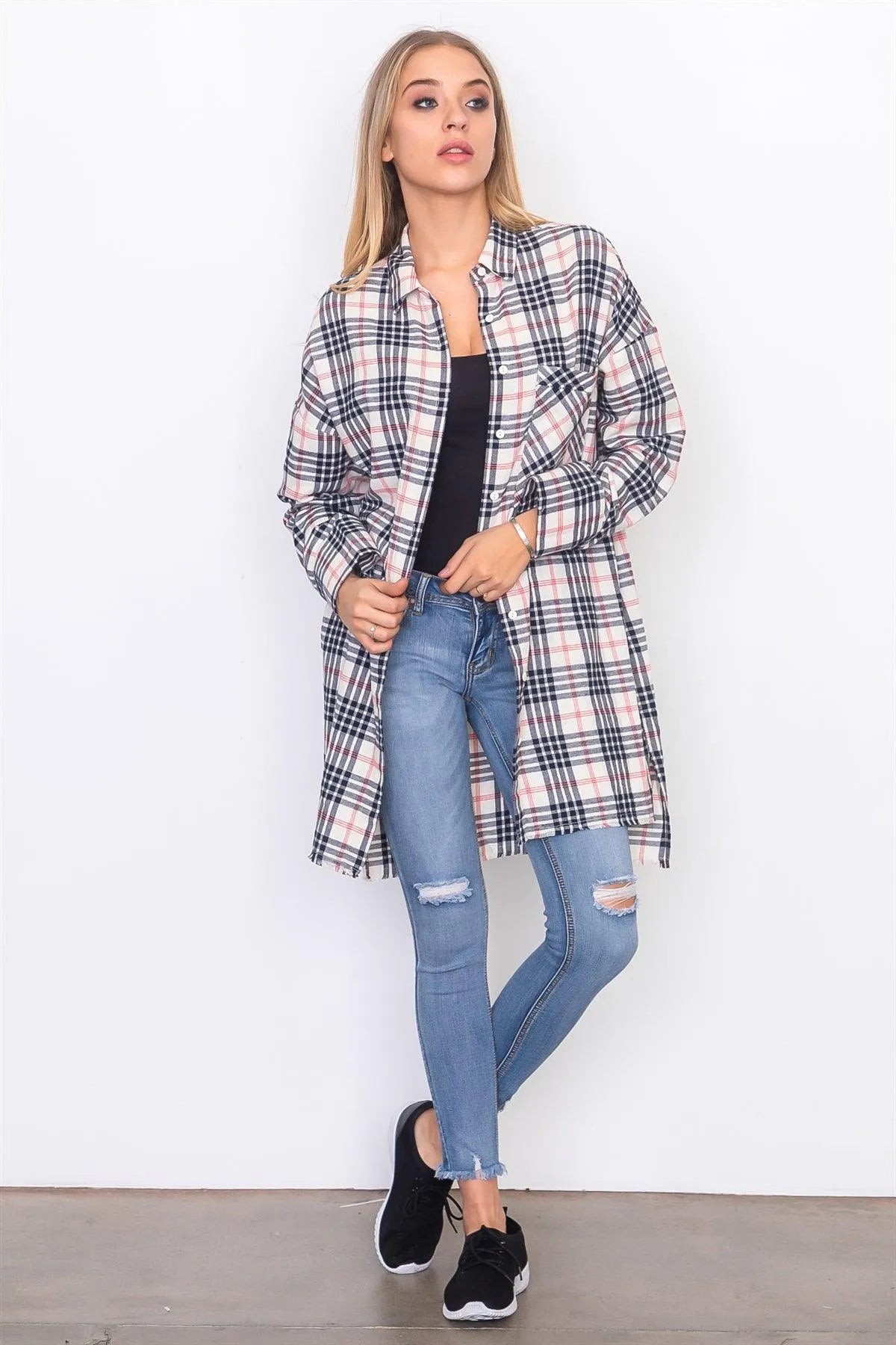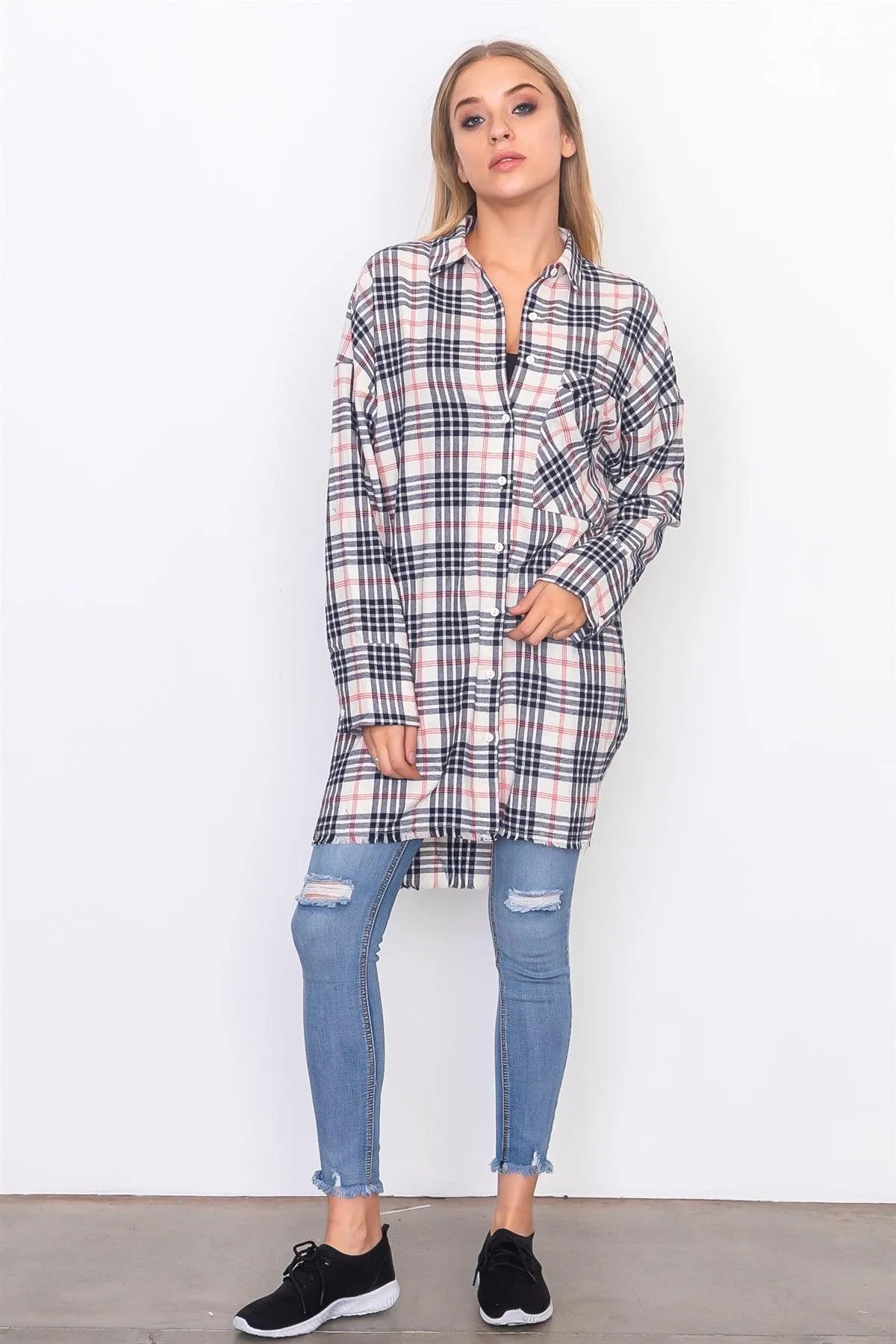 Cream Frayed Hem Plaid Button Down Shirt Dress /3-2-1
