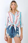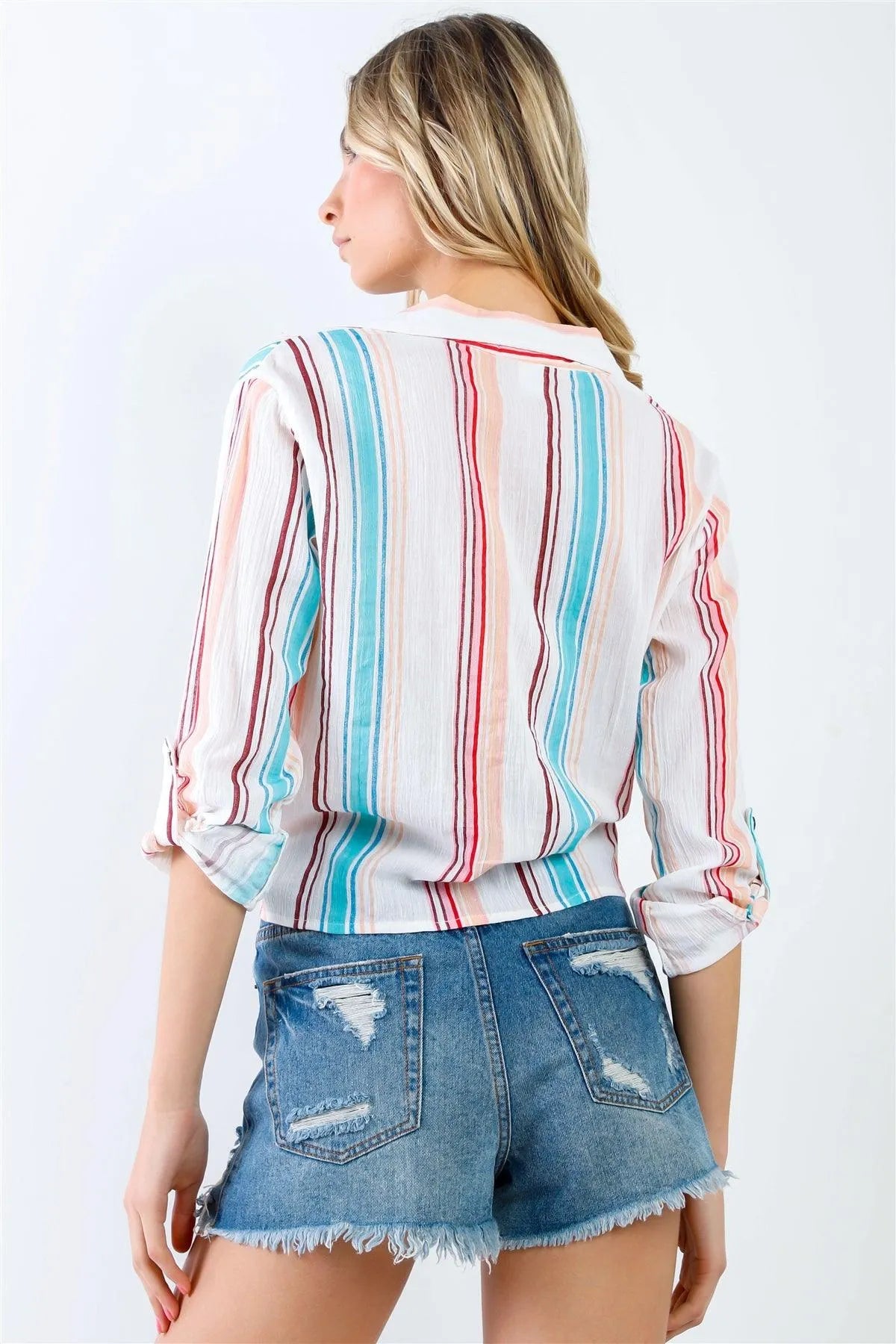 Cream Textured Multi Color Stripe Cotton Tie-Front Shirt Top /1-2-2-1