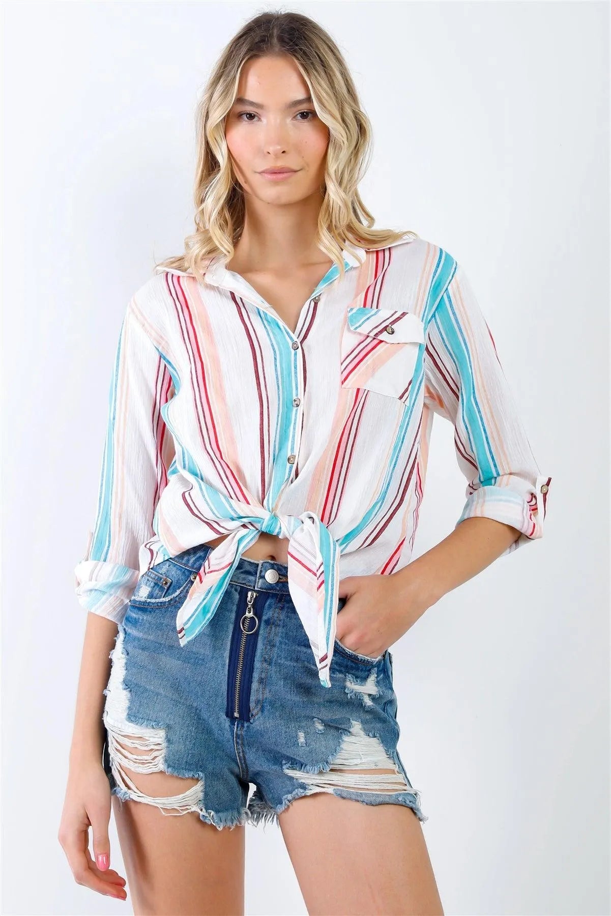 🖤 Item features: Cream, multi color stripe print, cotton material, tie-front detail, textured, collared, front button up closure, long cuffed sleeves with button up detail, non-stretchy, slightly sheer, unlined, casual, lifestyle, street wear, cute, stylish