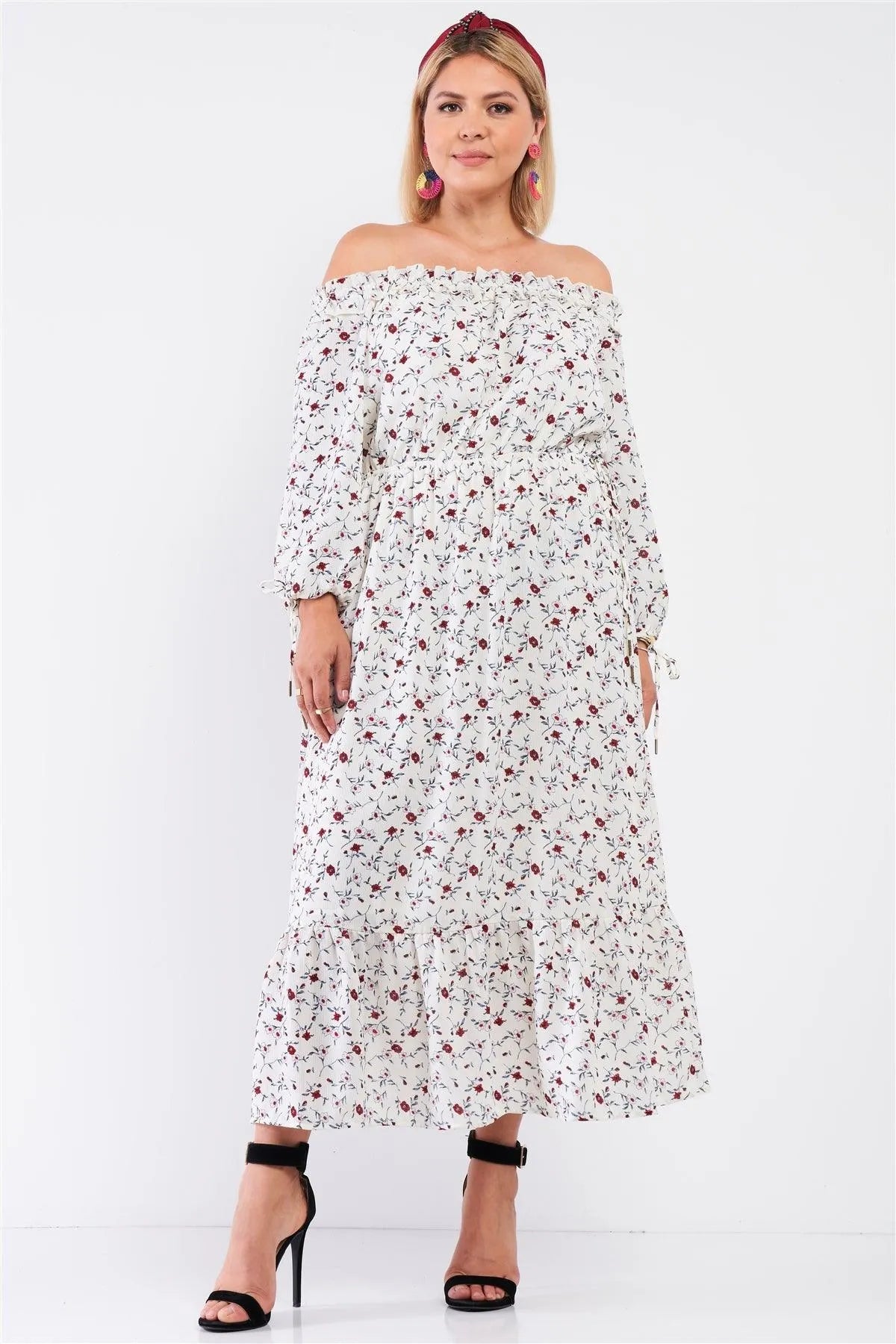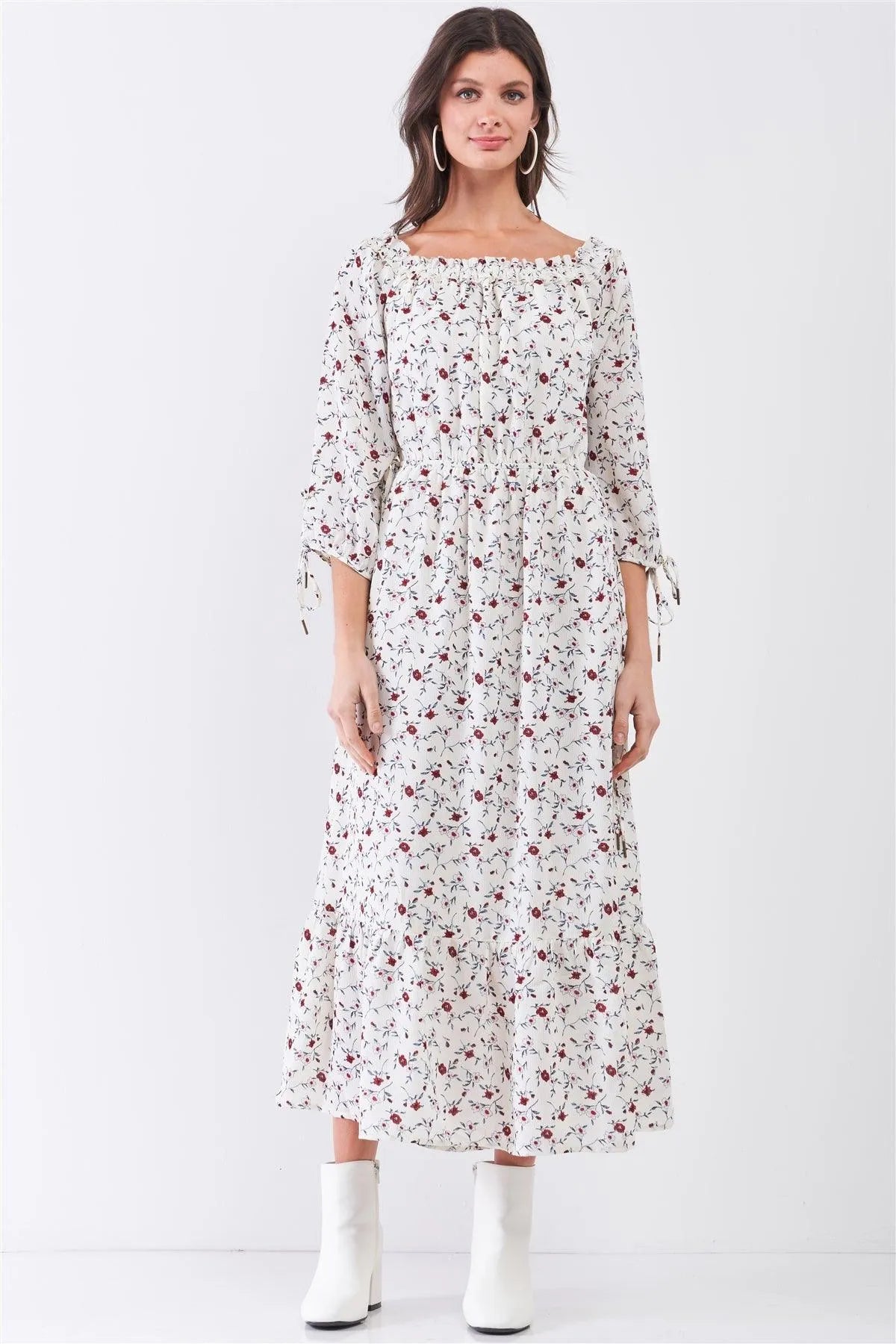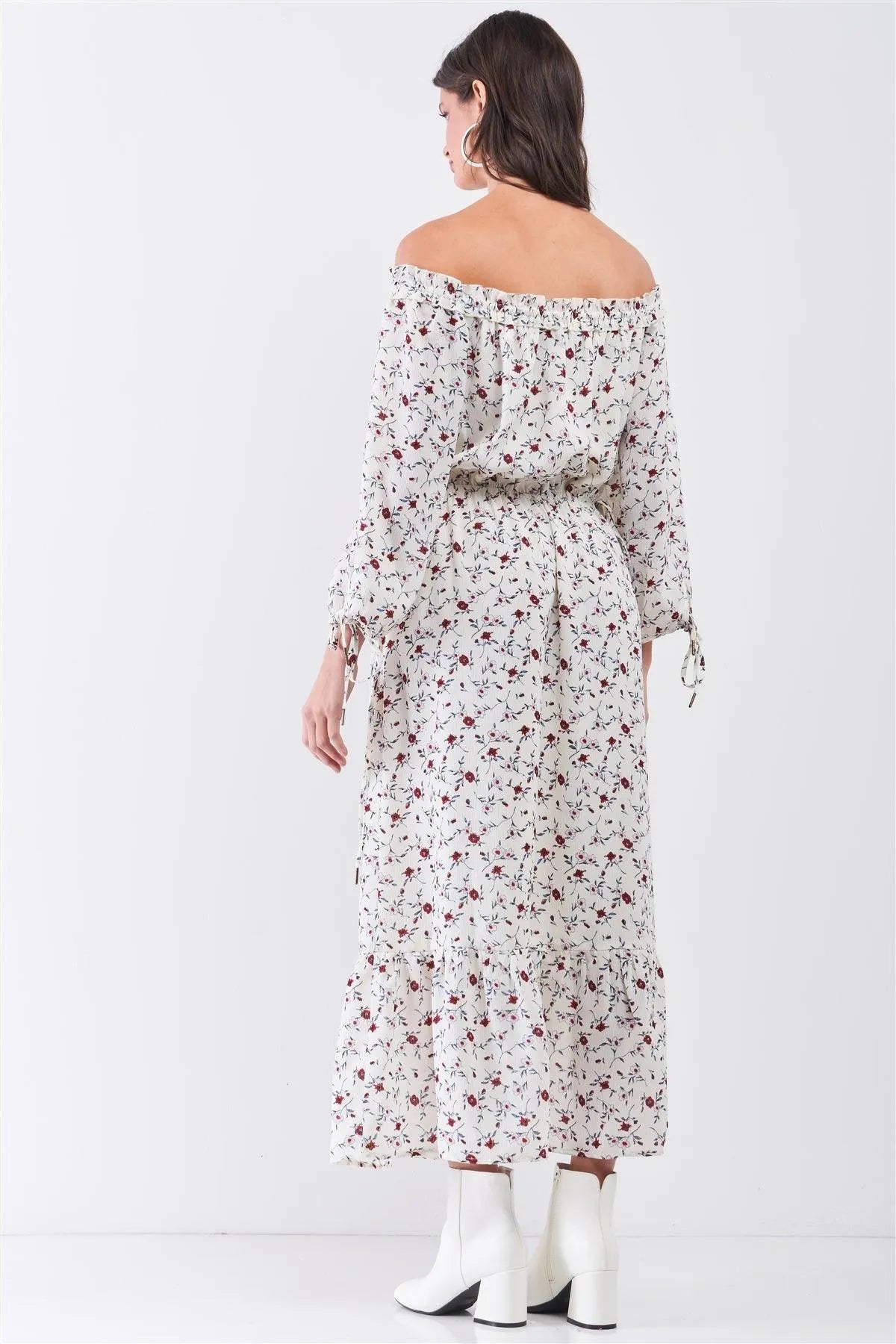 Dress Features: Cream, multi floral print, off the shoulder, high-waist, elastic waistband, ruffle hem, self-tie cuff detail, maxi length, lined, very stretchy, spring, summer, boho, beachwear, resortwear