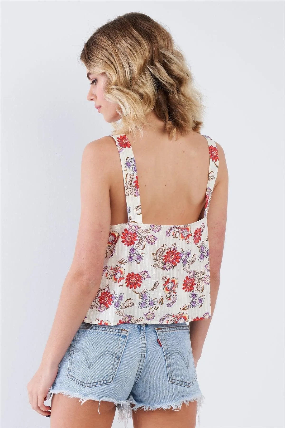 Cream Red Button Front Straight Neck Floral Tank Top /2-2-1