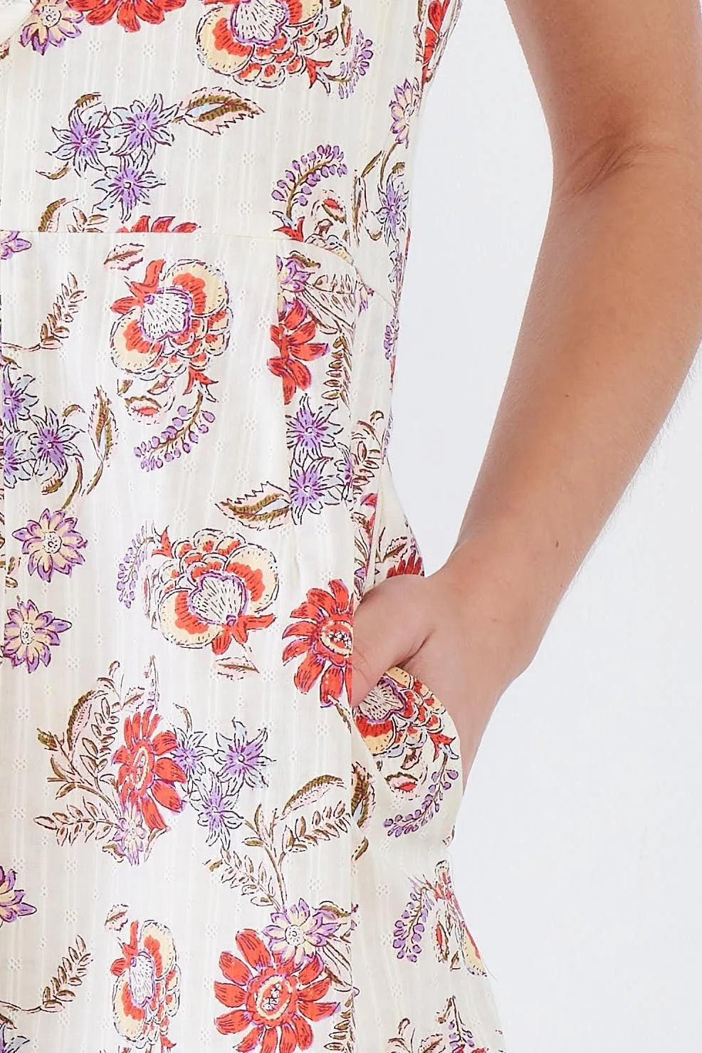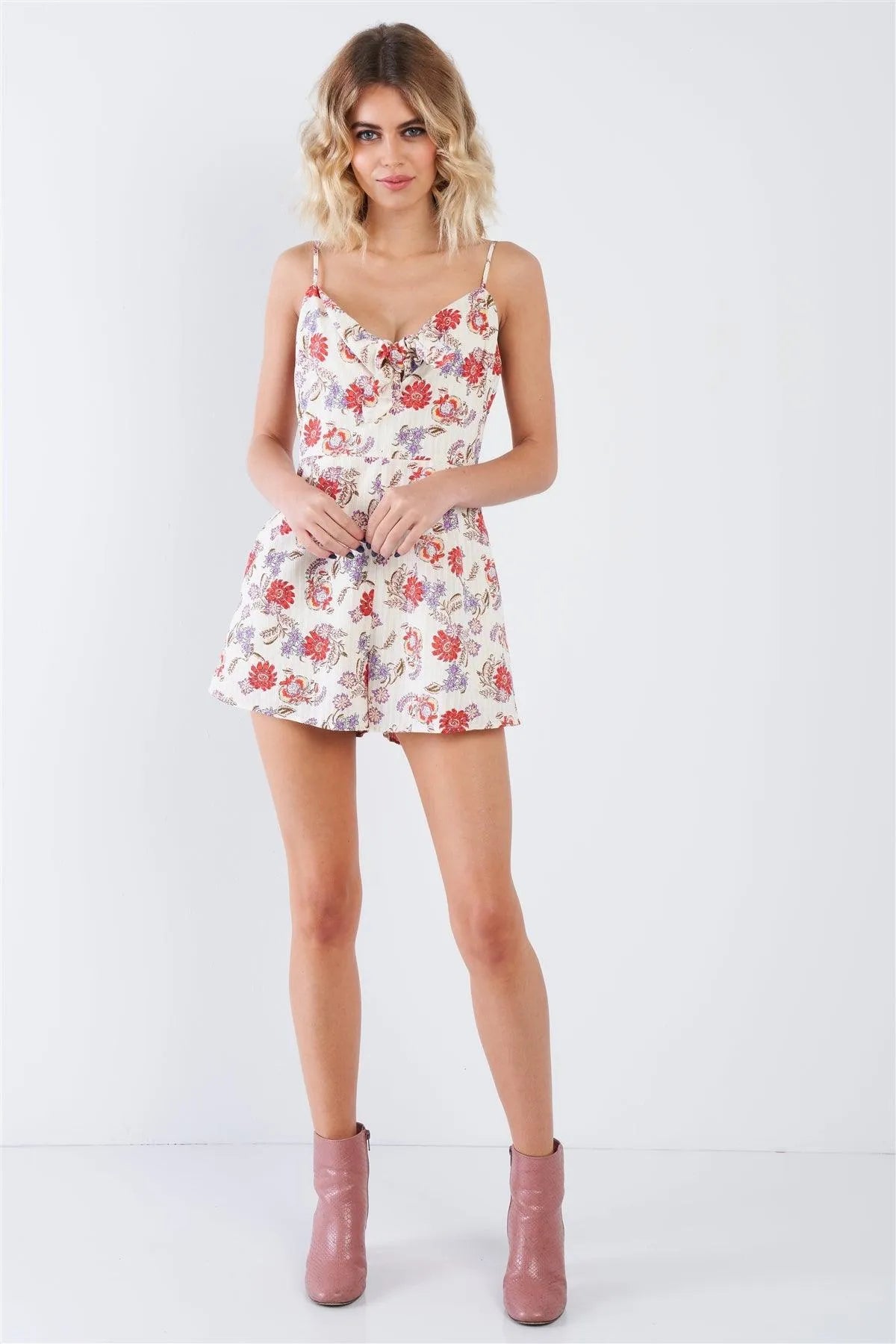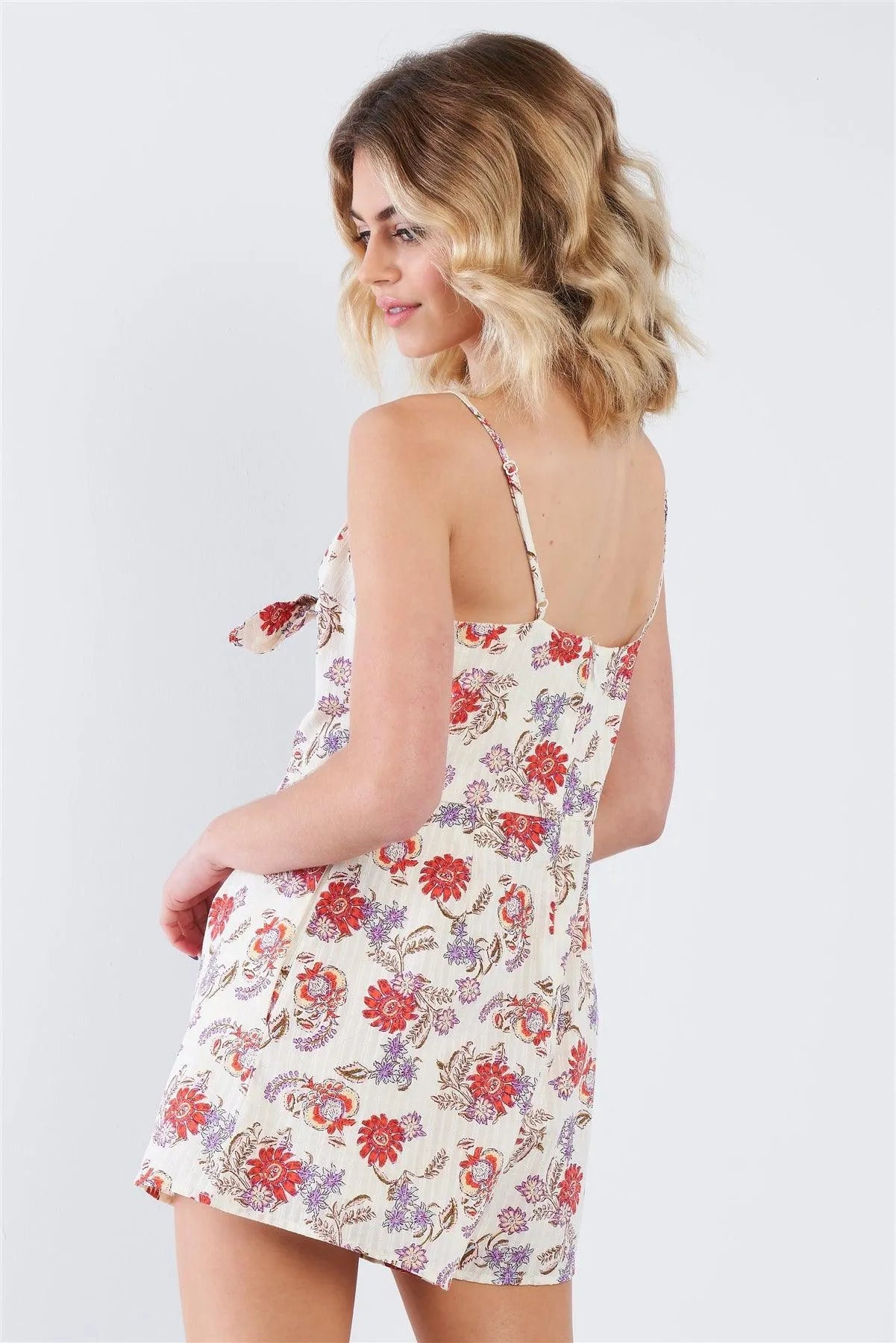 Romper Features: floral print, v-neck, front tie, sleeveless, darted bodice, adjustable straps, fitted waistline, back zipper, front pockets, boho, summer, Model is 5'9 wearing a size Small ( Waist: 23.5", Bust: 32B, Hips: 36")Item Measurements: Length: 21" , Bust: 26"True to size
