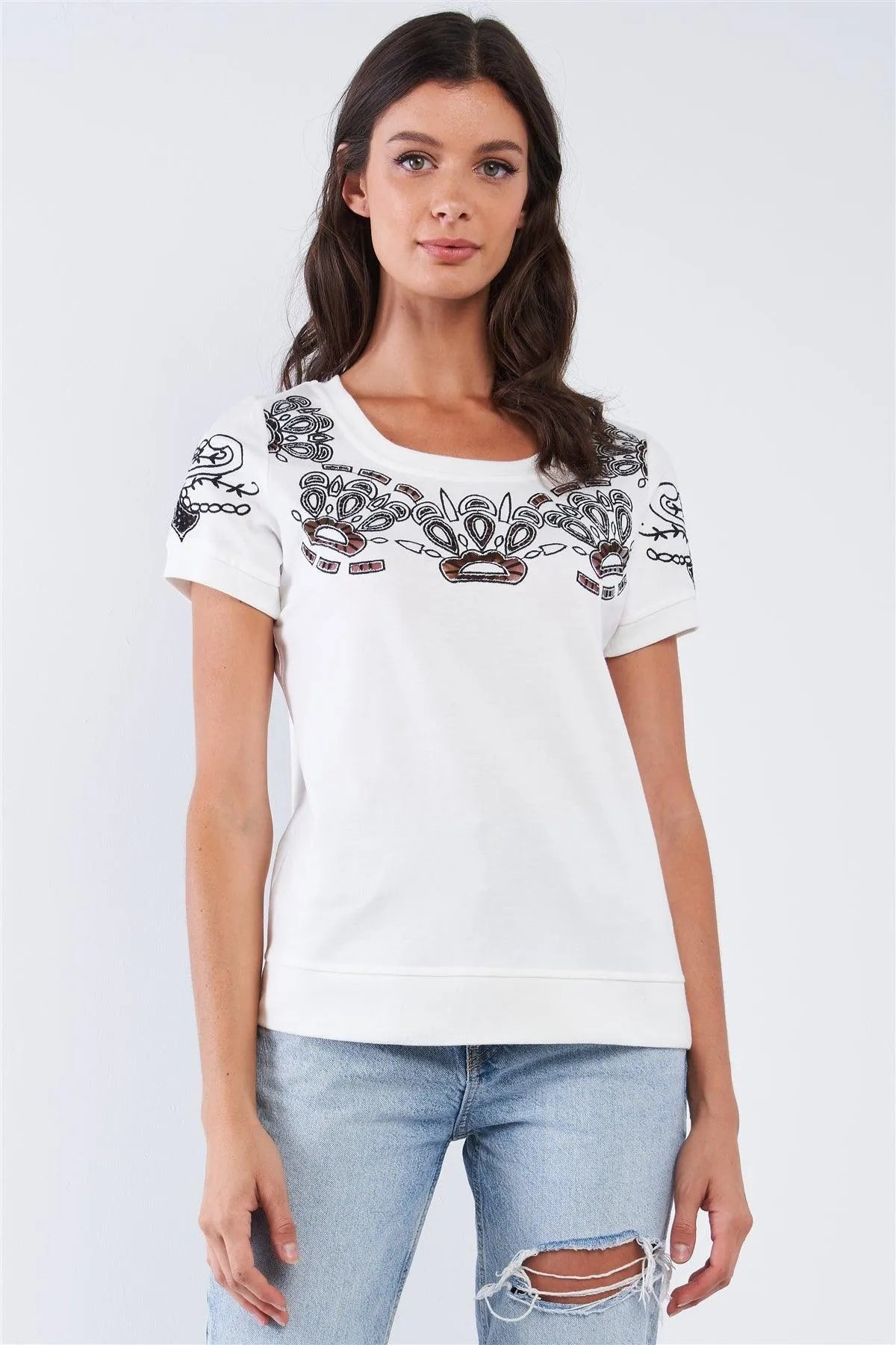 Cream Short Sleeve Black Embroidered Ribbed Hem Crew Neck Top /1-2-2-1