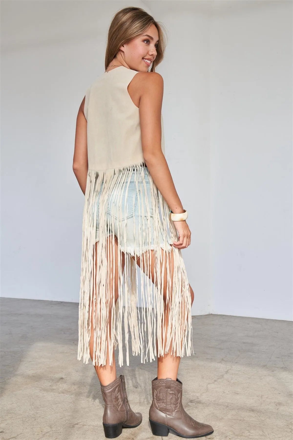Cream Sleeveless Suede Cropped Boho Vest With Long Fringe Detail /2-2-2