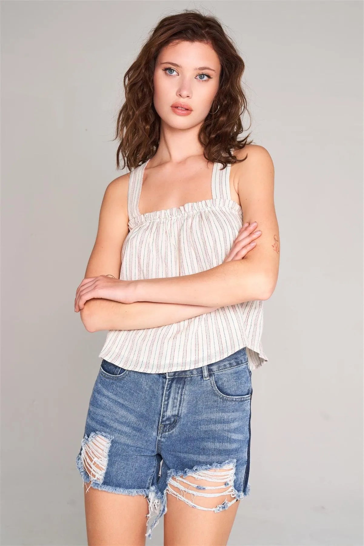 Cream Stripped Sleeveless Square Neck Criss-Cross Back Detail Frill Apron Top /3-2-1