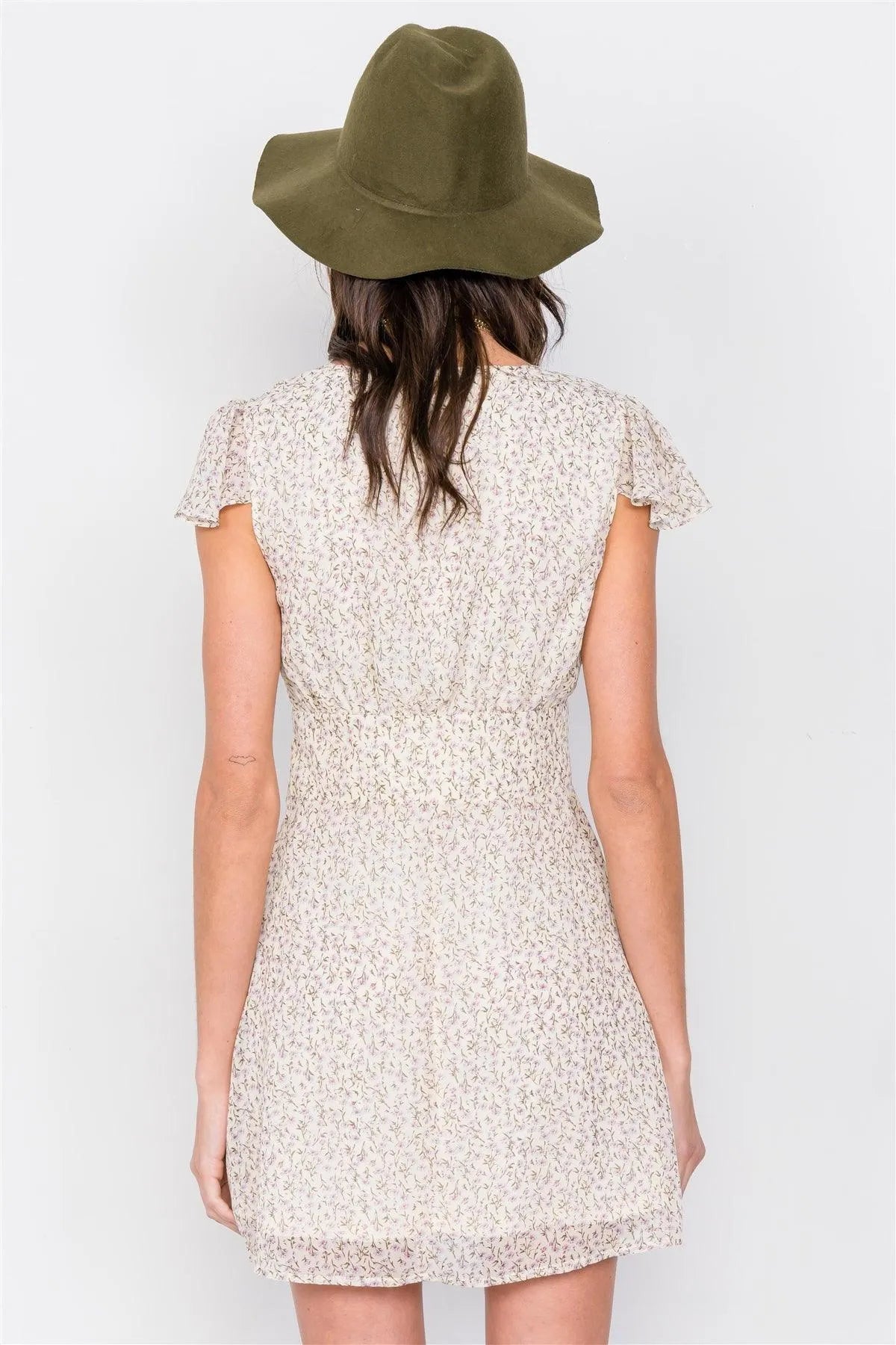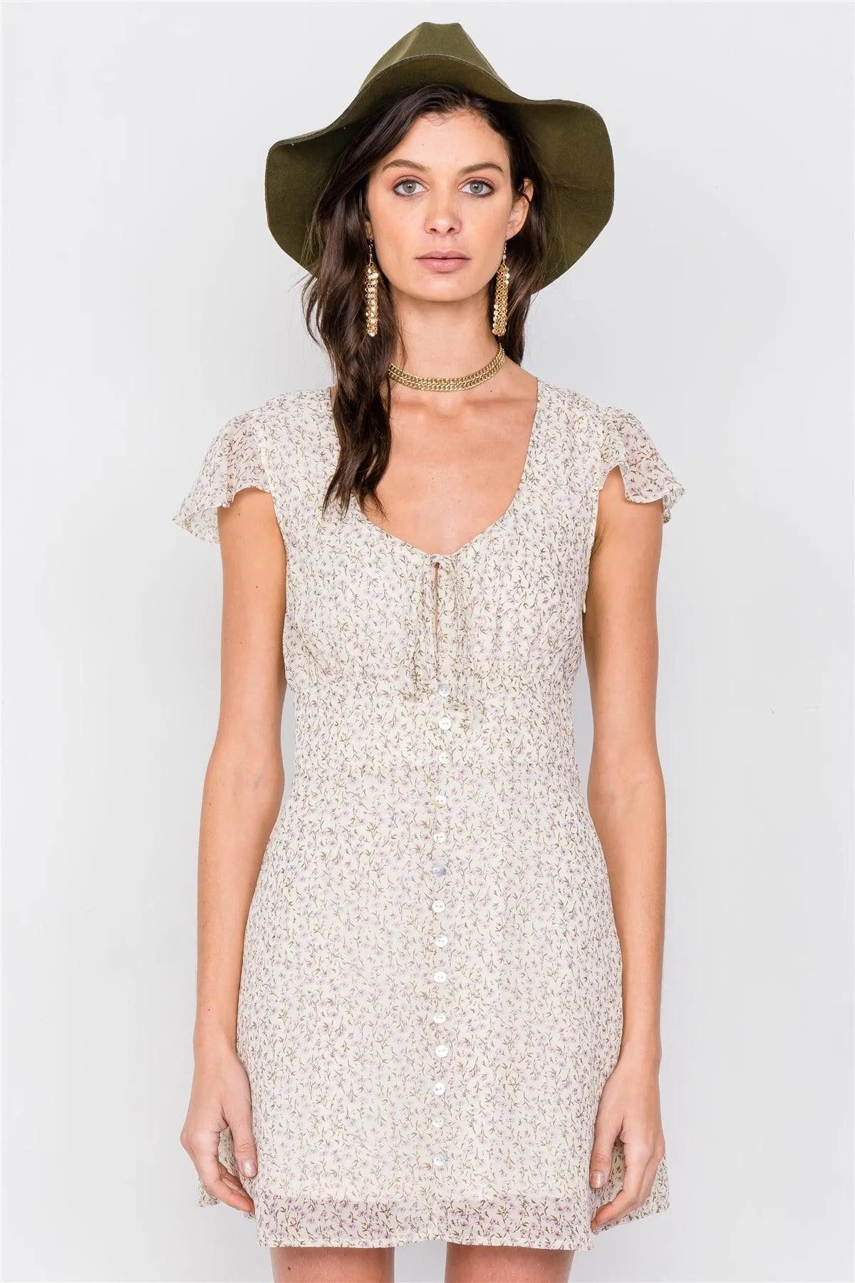 Cream Yellow Scoop Neck Front Button Floral Mini Dress /2-2-1