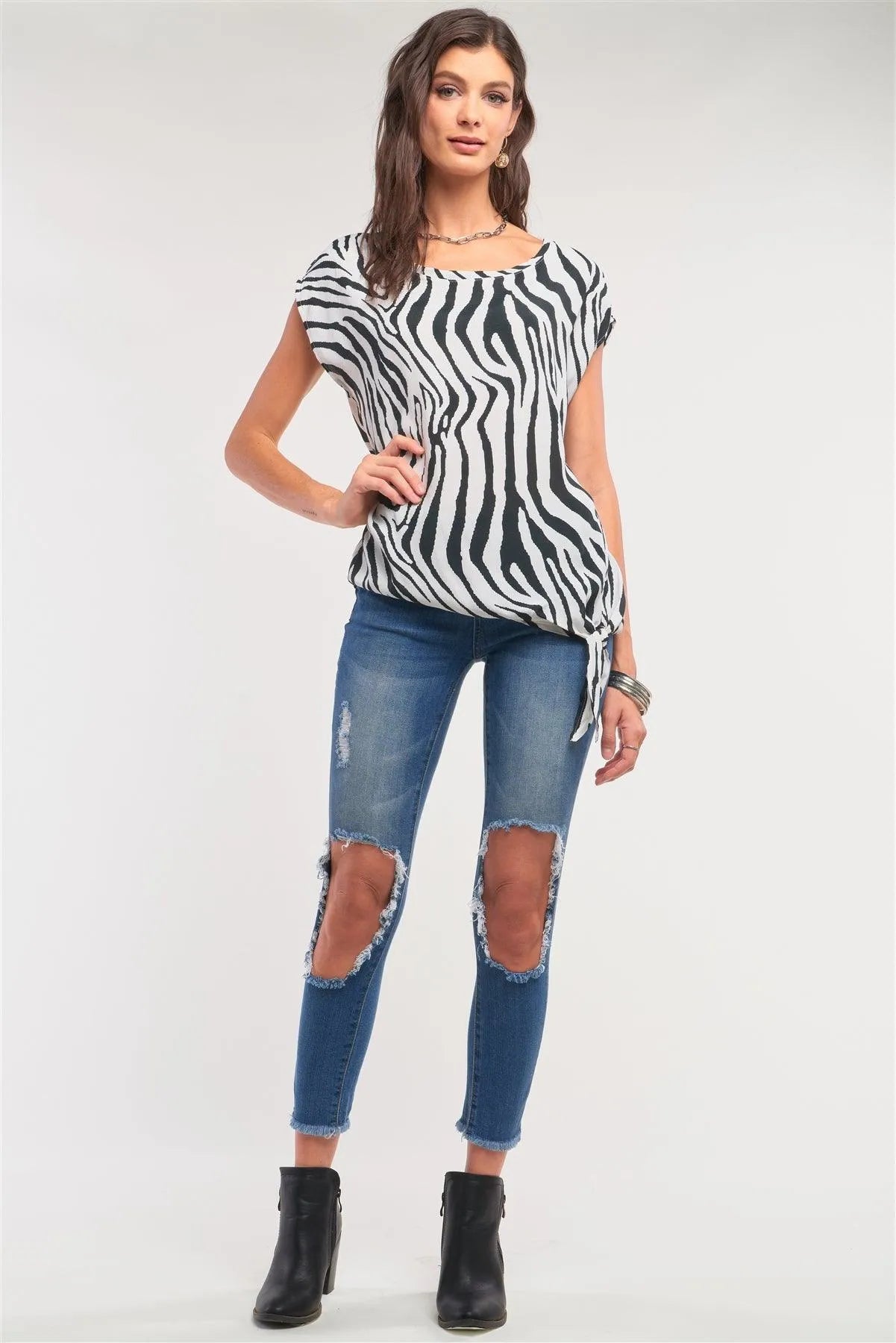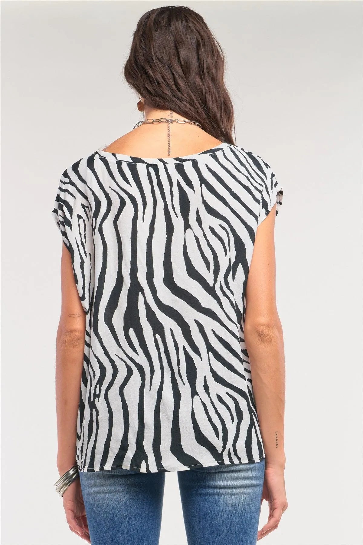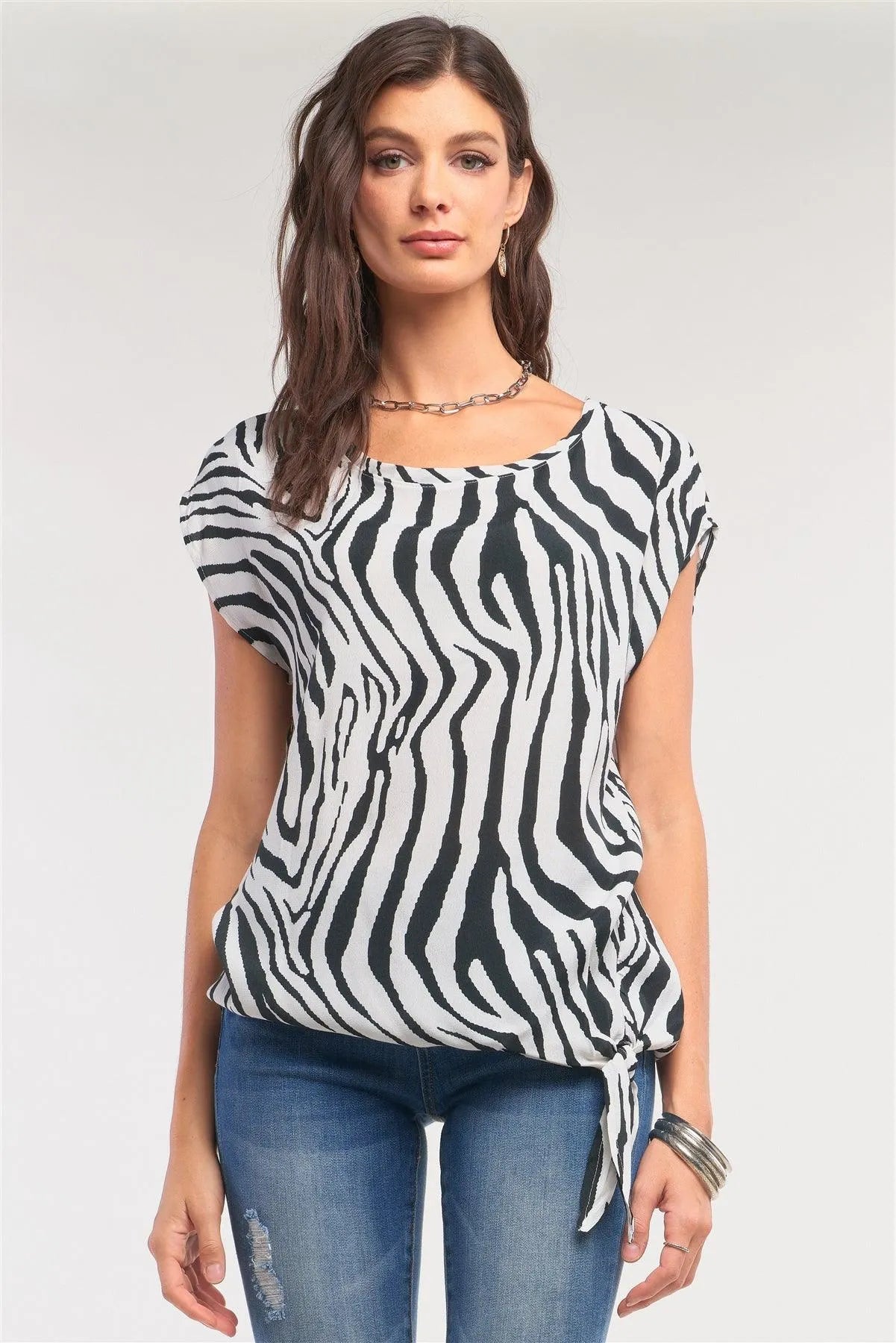 Cream&Black Zebra Print Loose Fit Round Neck Self-Tie Detail Top /2-2-2