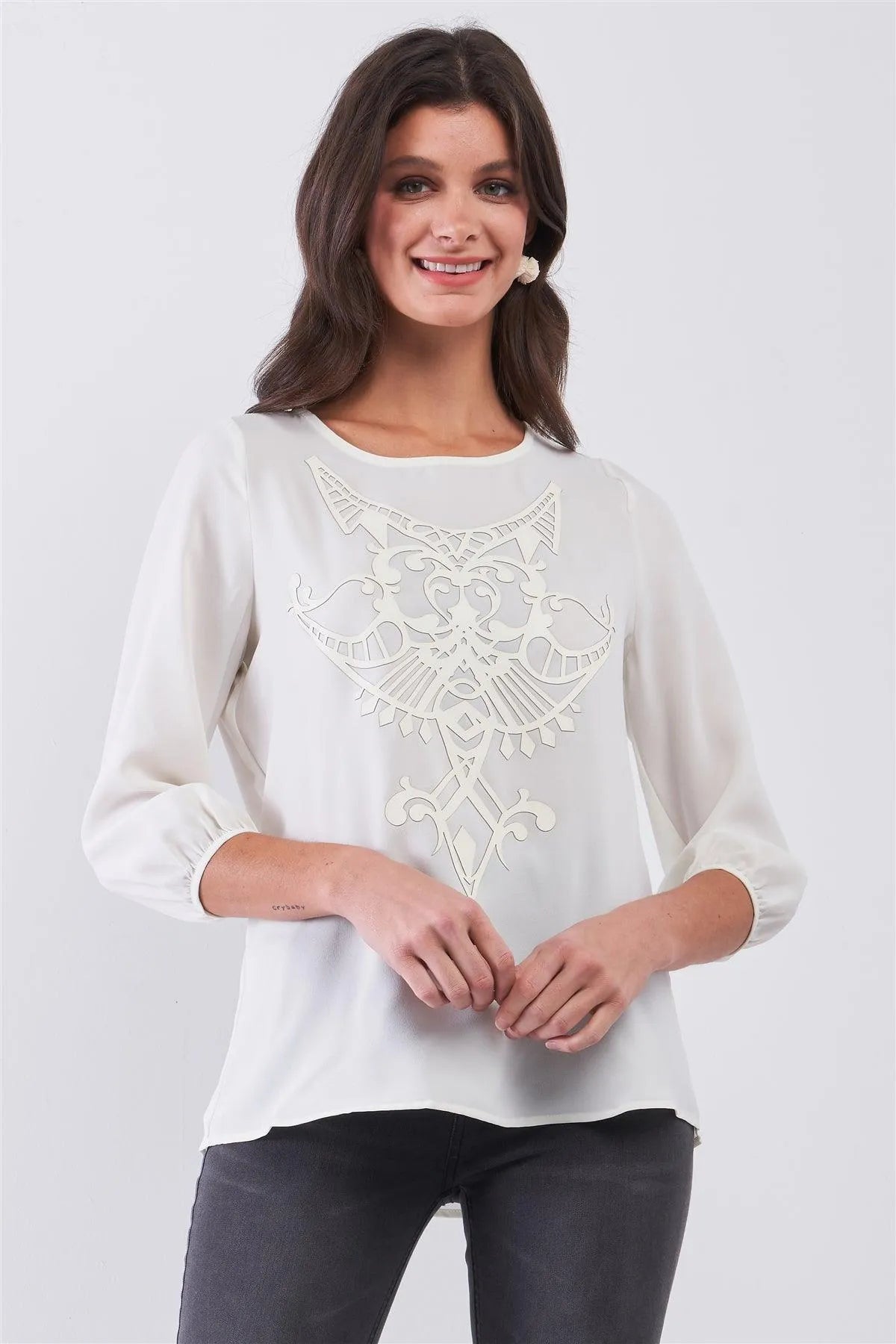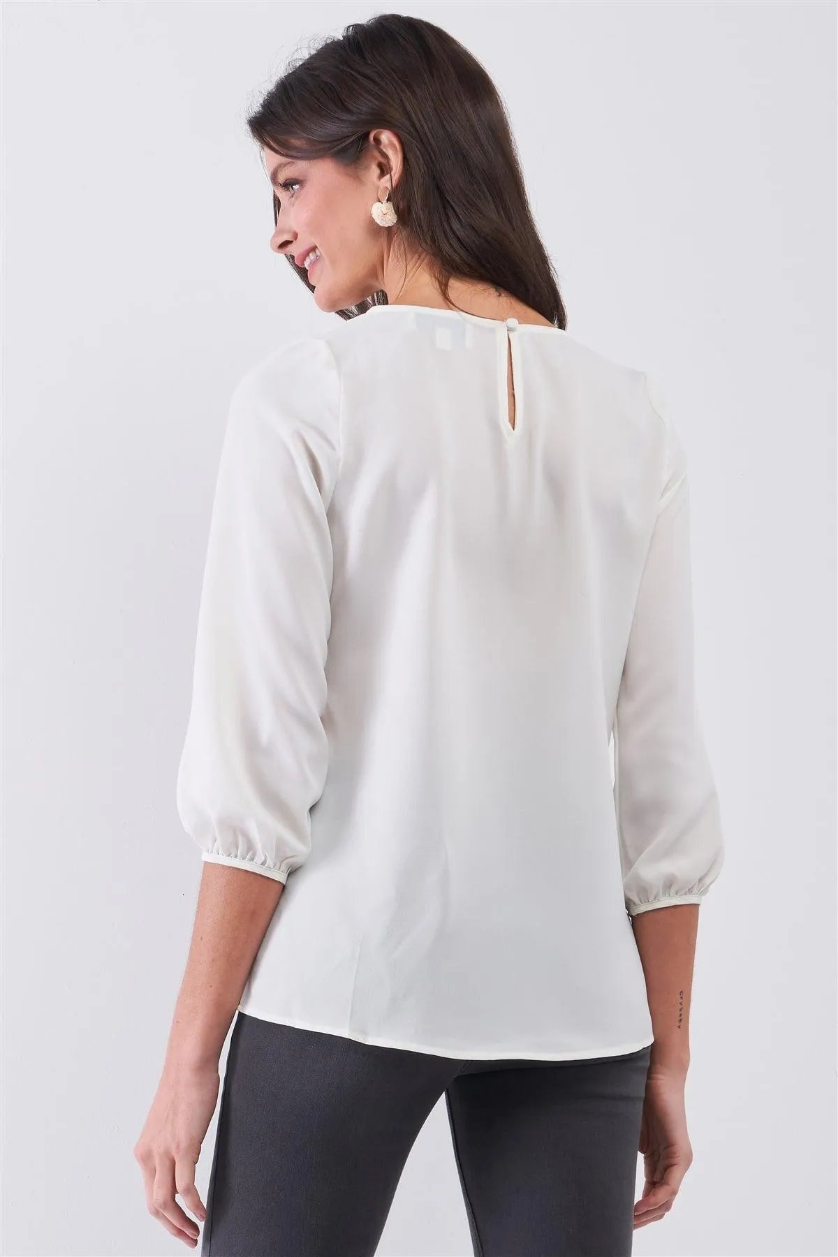 Creme Round Neck 3/4 Puff Sleeve Vegan Leather Front Detail Loose Fit Top