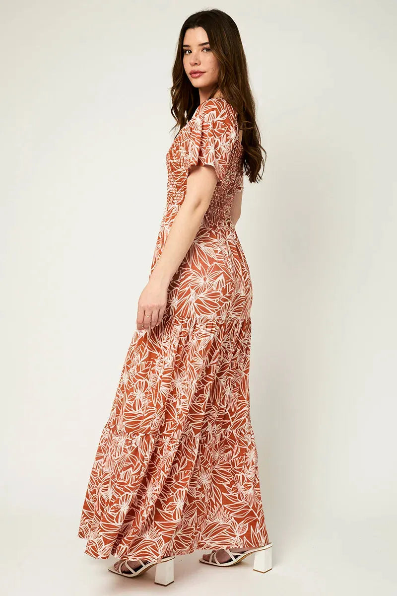 Floral Smocking Bust Tiered Hem Maxi Dress