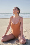 🖤Item Features: Dark adobe & butterscotch, glossy finish, solid colors, double sided, round neckline, deep scoop backline, sleeveless, adjustable shoulder straps, adjustable tightness self-tie lace-up sides, high hip fit, stretchy, lined, one-piece, cute, sexy, new swimwear collection