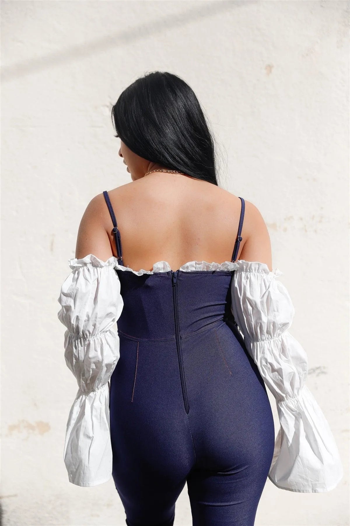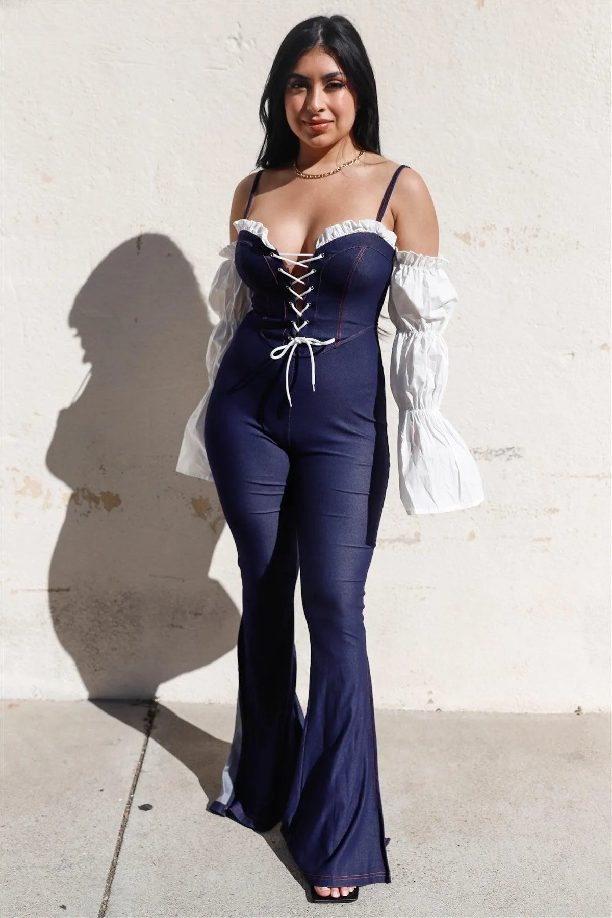 Dark Blue Denim Contrast Off-The-Shoulder Lace Down Front Virago Sleeve Flare Leg Jumpsuit /2-2-2