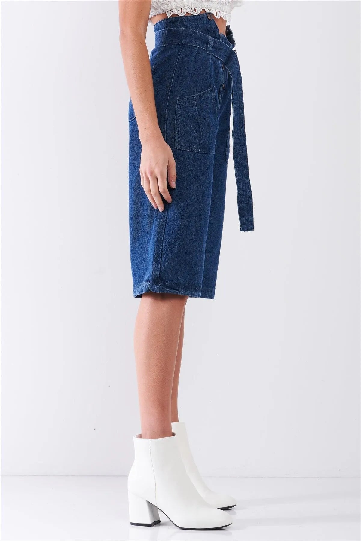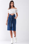 🖤 Item Features: Dark blue, denim, front cut-out high waist, buckle self-tie belt detail, front button-up closure, front & back pockets, midi knee-length, flare cut, unlined, non-stretch, casual, stylish, vintage vibe, spring/summer collection