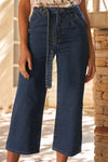 Dark Blue High-Waisted Cropped Wide Leg Self-Tie D-Ring Belt Denim Pants /1-1-2-2-1-1