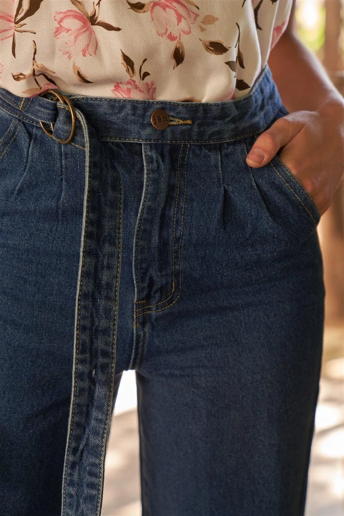 🖤 Item Features: Dark-blue, high-waisted, cropped length, self-tie belt imitation with d-ring buckle, two side pockets, two back faux pockets, non-stretch, fly zip and button closure, denim, retro style, vintage