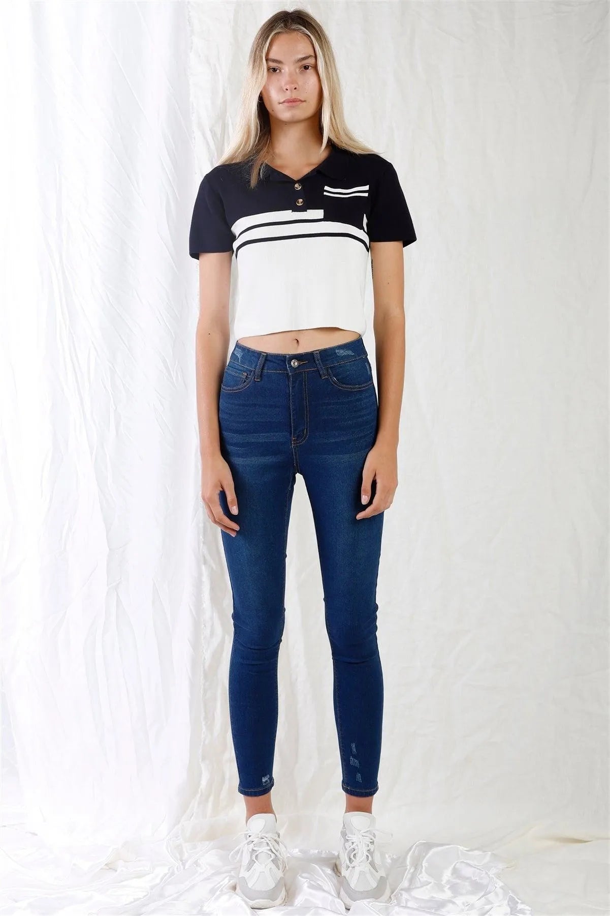 🖤 Item Features: Denim, dark blue, high rise, five pockets construction, small rips on the leg bottom & on the pockets, belt loops, contrast thread stitch, back brand patch, hardware merchandised buttons, skinny fit, stretchy, front fly zipper, front button closure, simple design, high quality jeans, all-season wear, stylish, casual, wardrobe must have