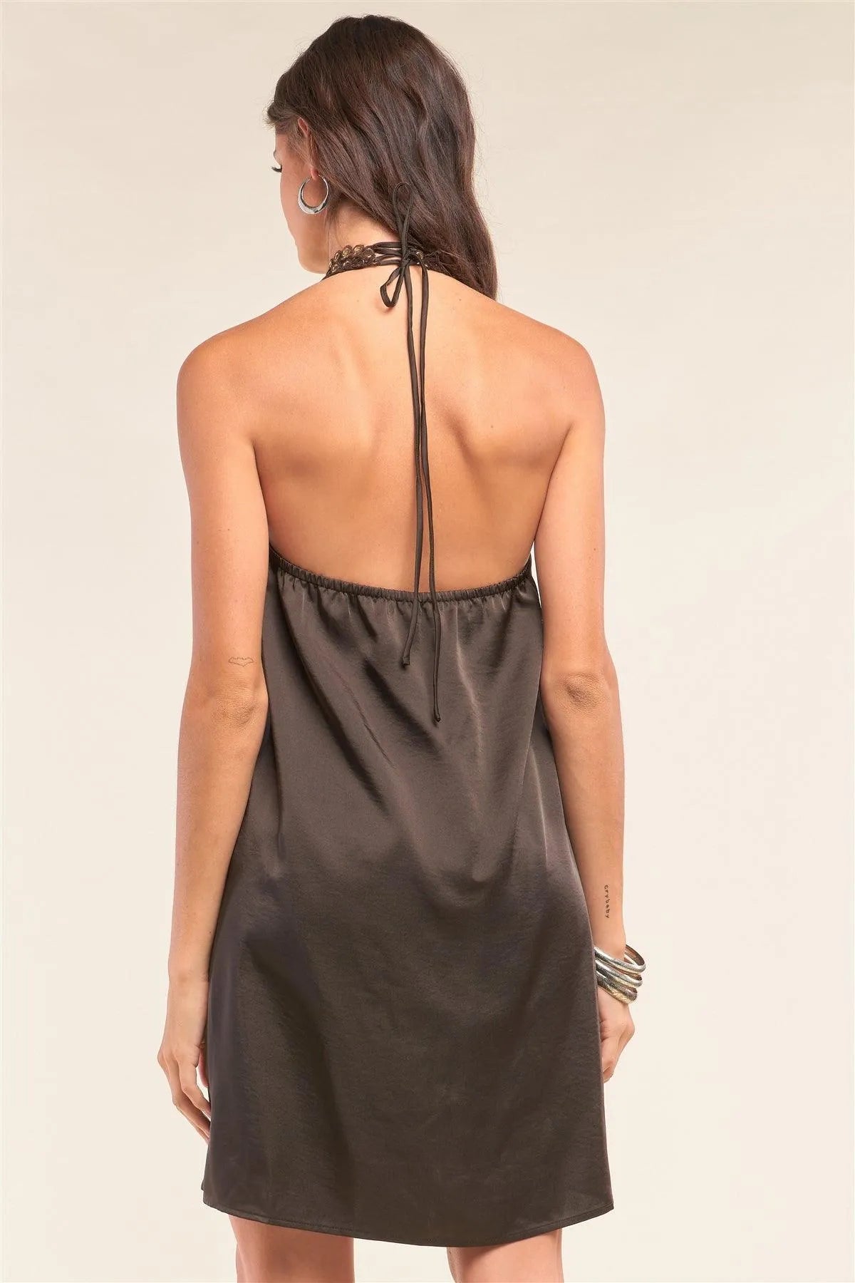 Dark Brown Satin Sleeveless Relaxed Fit Keyhole Trim Self-Tie Halter Neck Open Back Mini Dress /1-2-2-1