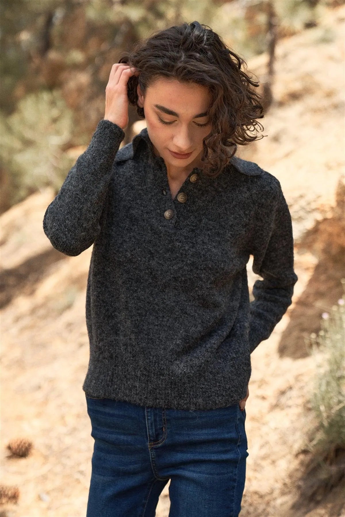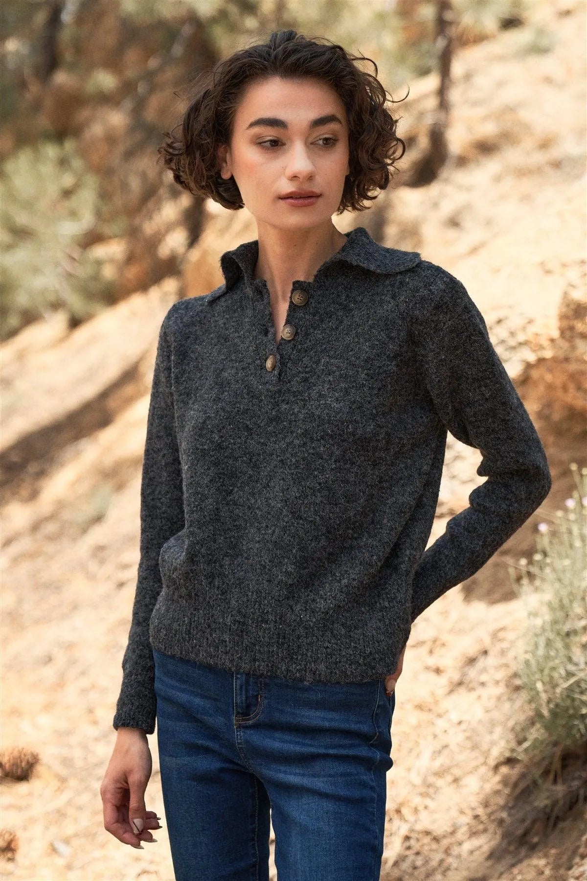 🖤 Item Features: Dark charcoal, solid color, faux wool knit construction, buttoned & collared neckline, long slim sleeves, ribbed bottom hem, regular fit, unlined, non-sheer, stretchy, casual, warm, cozy, vegan, fall/winter collection.