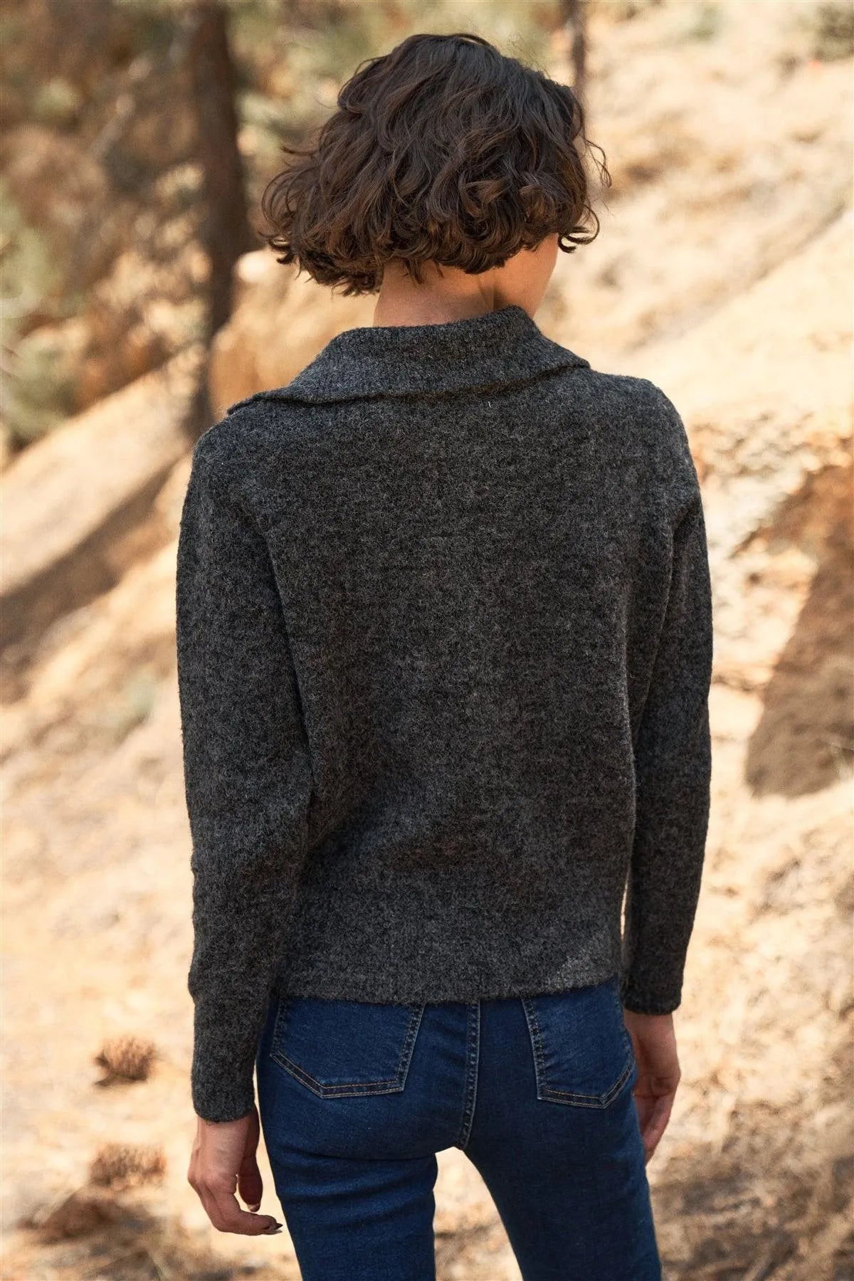 Charcoal Faux Wool Collared Neck Gauge Sweater Top