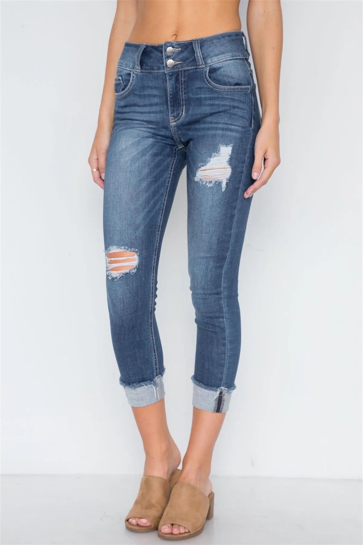 Take on new risks and push your fashion boundaries with our Dark Denim Cuffed Hem Skinny Jeans. Embrace a bold mid-rise fit and ankle length, while the distressed, cuffed, and frayed hem adds a touch of risk-taking attitude to your style. With a five-pocket construction, these jeans offer both function and fashion in one package. Dare to stand out in these daring jeans!
