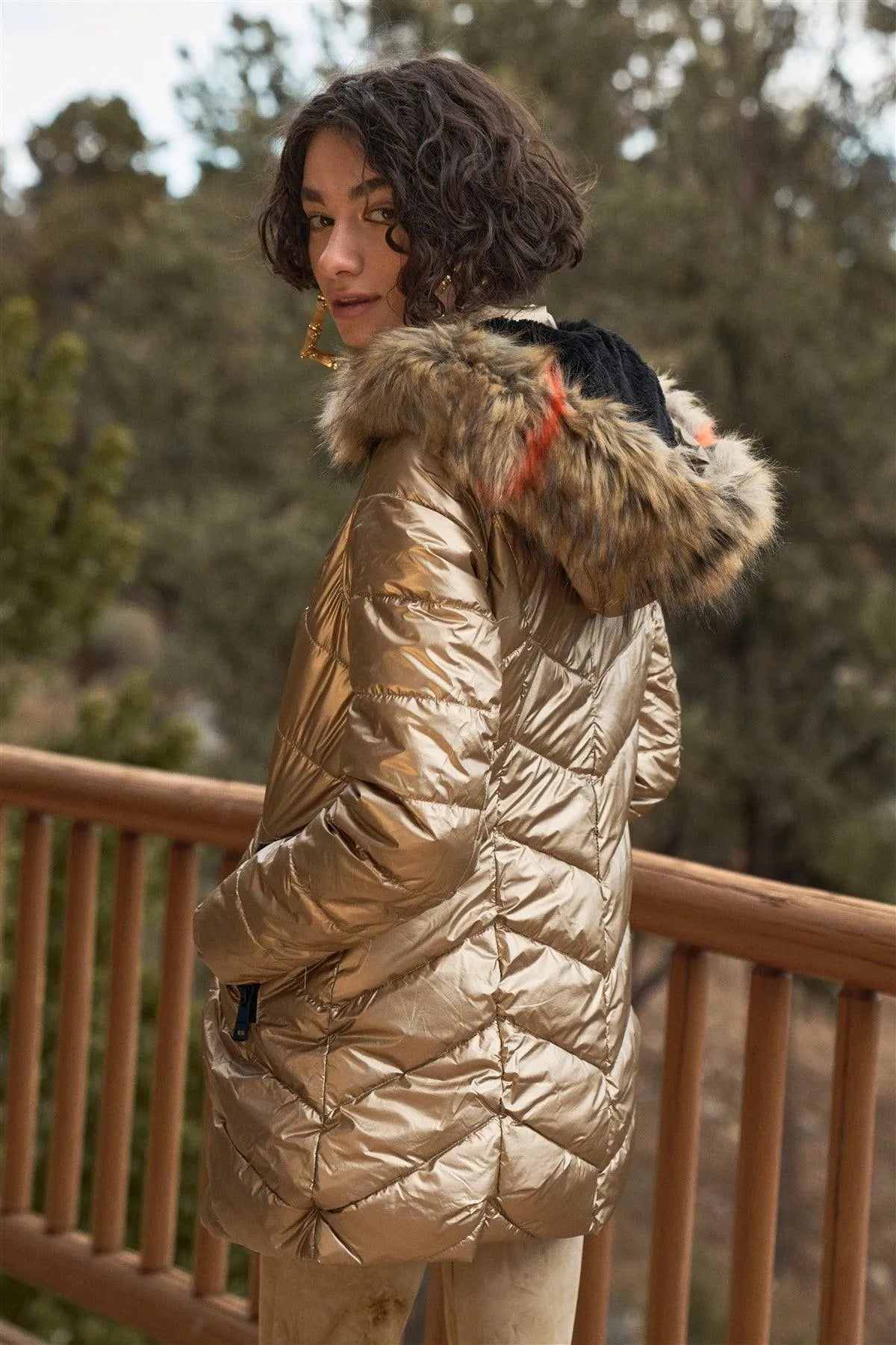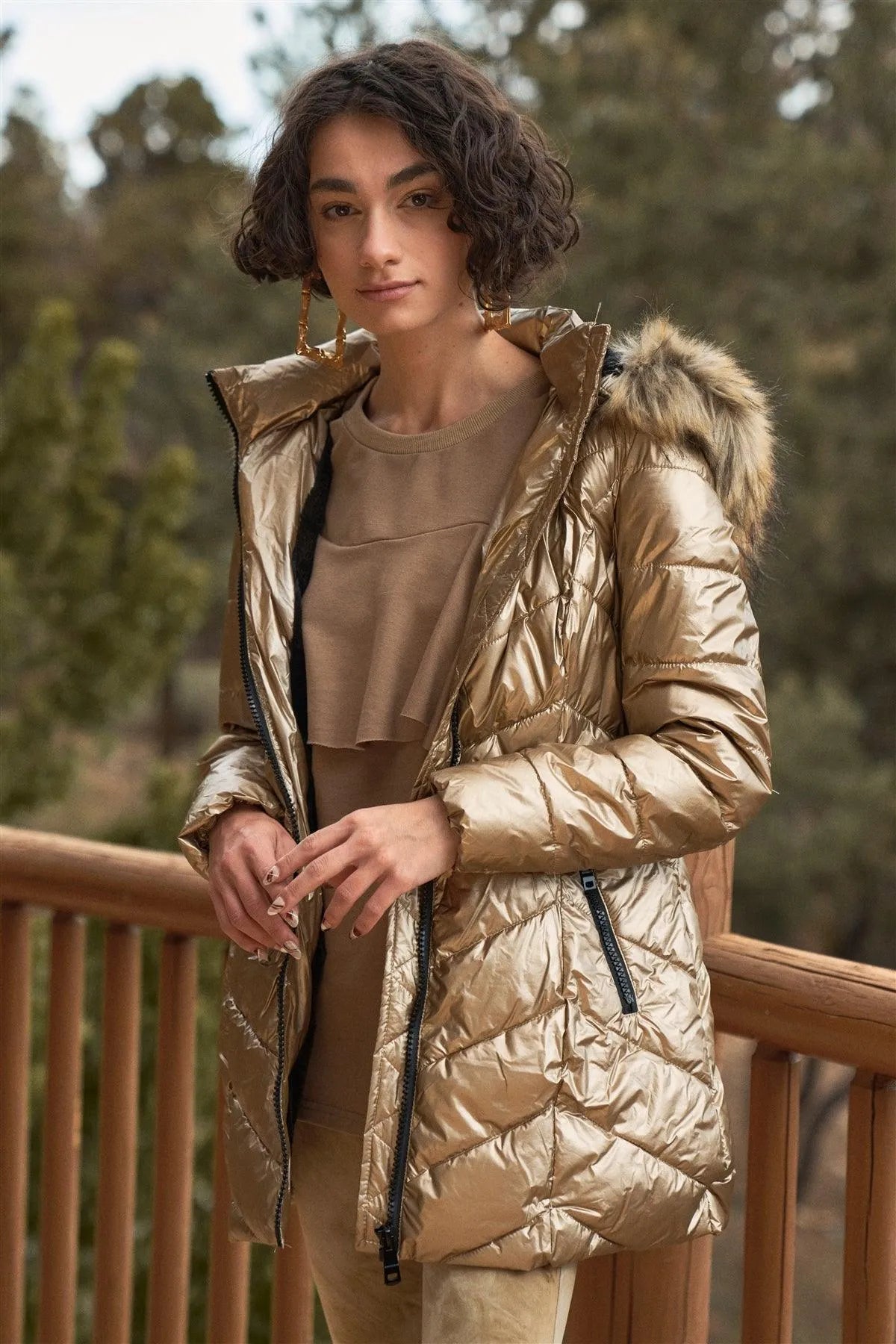 Dark Gold Glossy Finish Fitted Faux Fur Hood Chevron Padded Puffer Jacket /1-1-1-1
