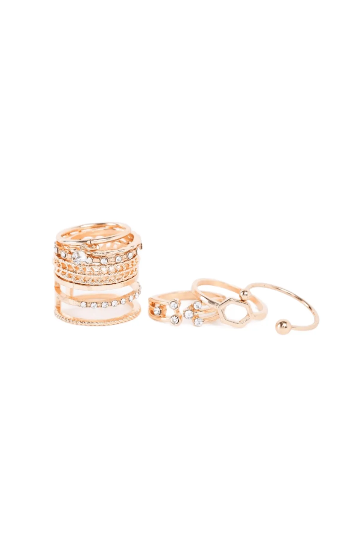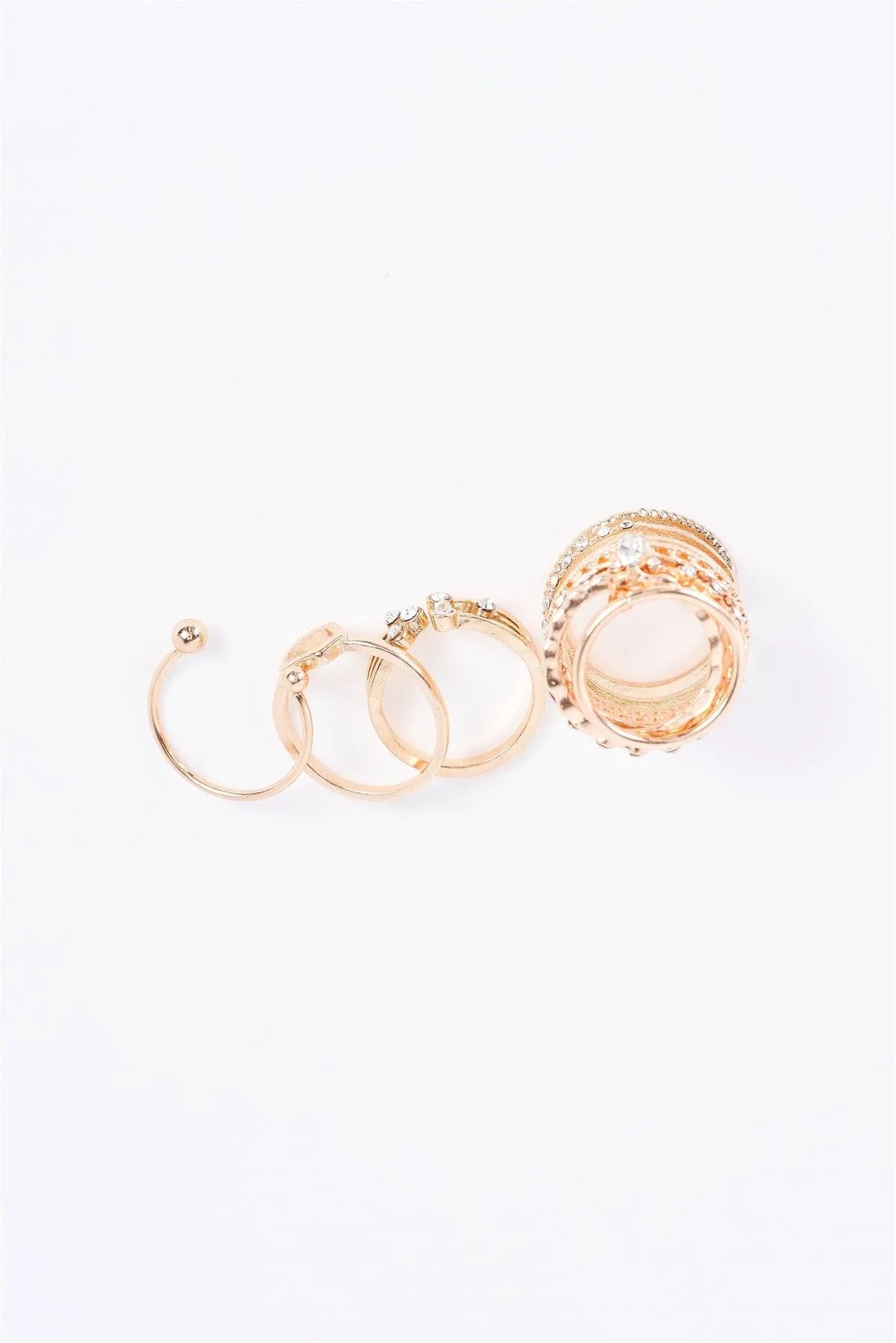 Dark Gold Multi Sized Set Of Eight Rhinestone Rings