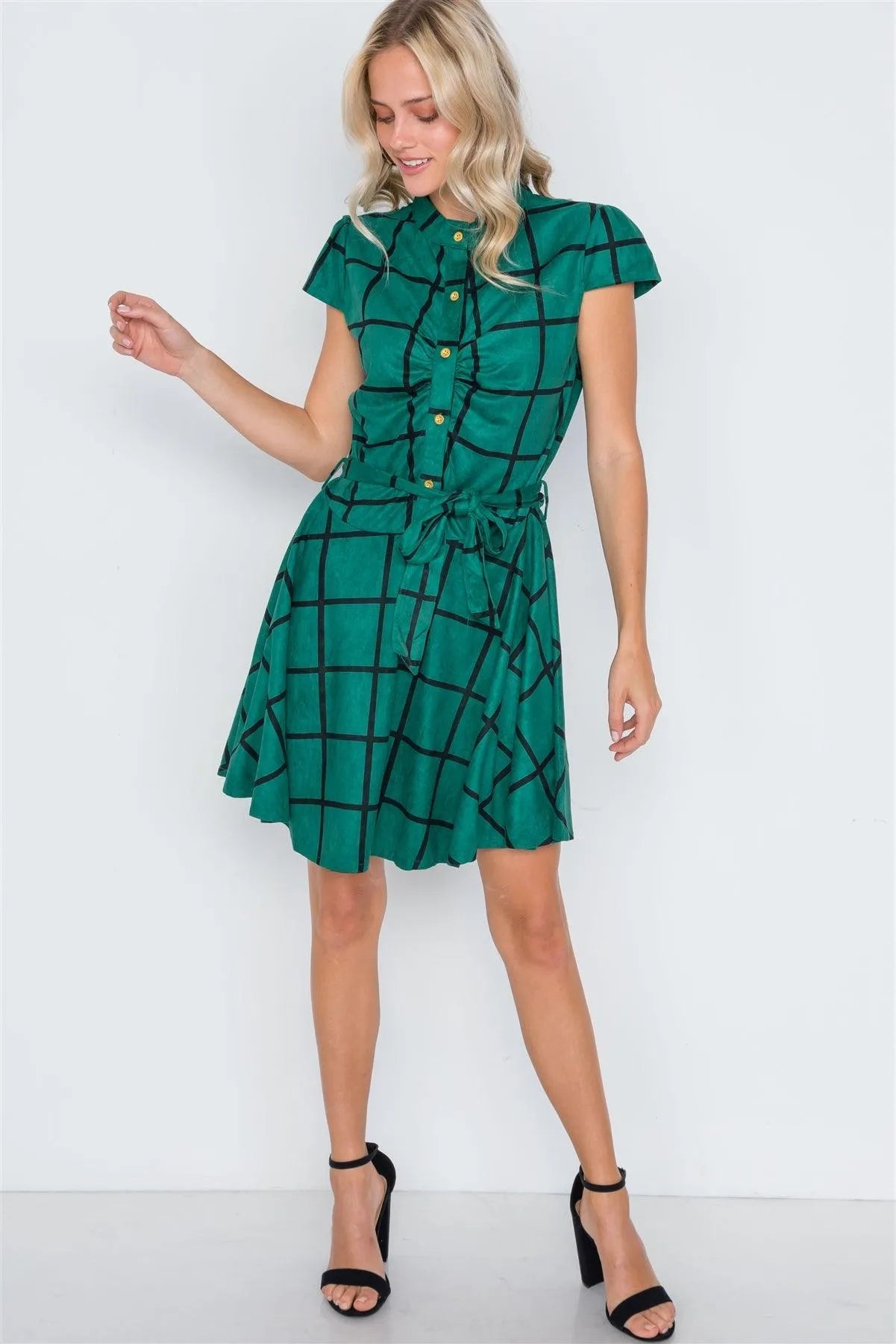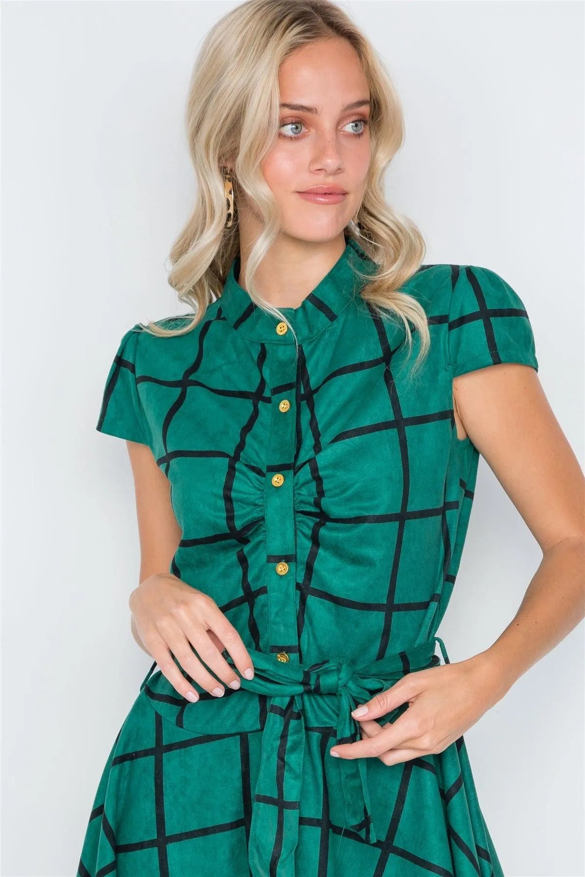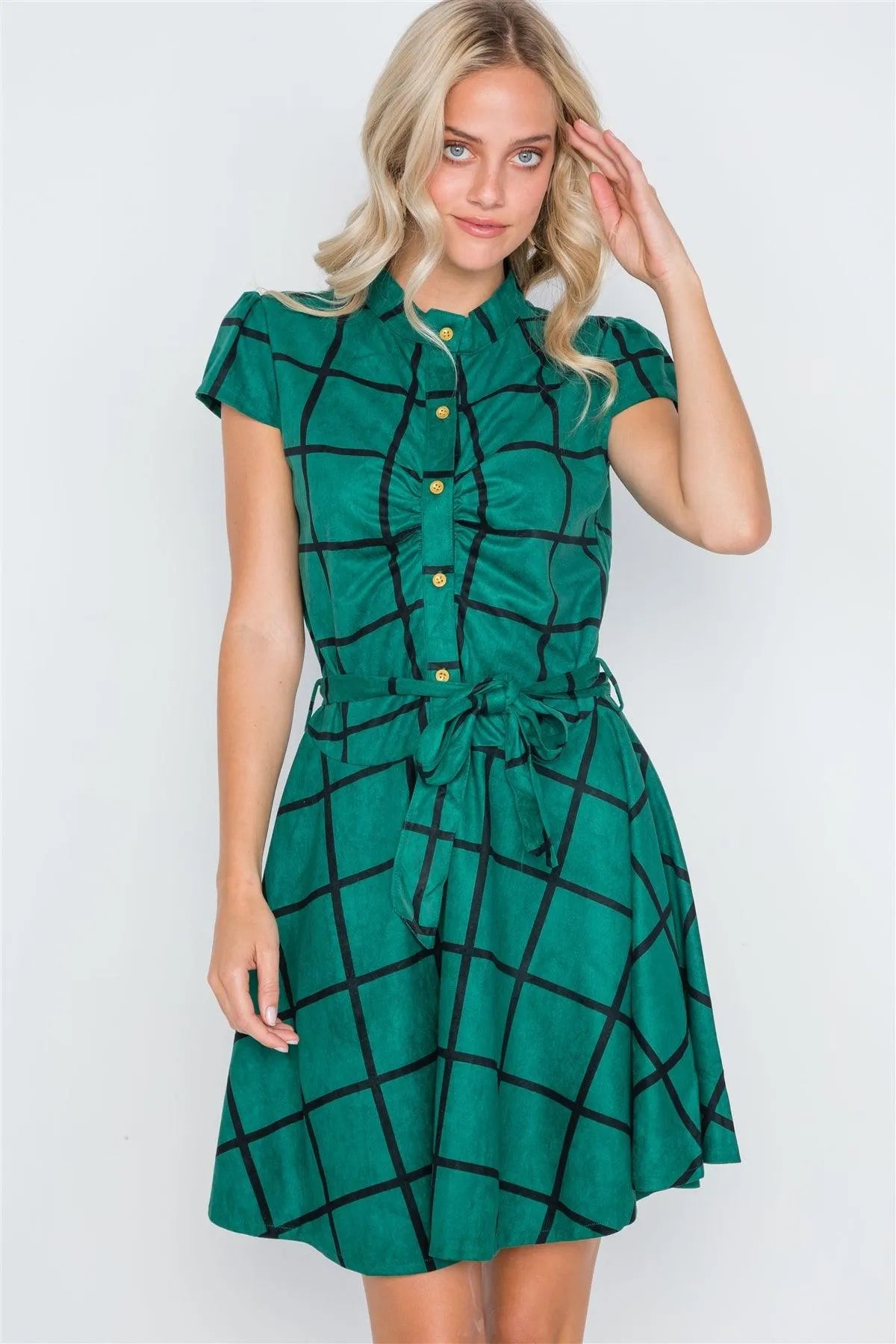 Dress features: cap sleeves, check pattern allover, front button closure, A-Line silhouette, self tie waist belt, mini length, unlinedModel is 5'9 wearing a size Small ( Waist: 24", Bust: 32A, Hips: 34")Small Size Item Measurements: Length: 36.5", Bust: 36" Sleeves: 4.5"True to size
